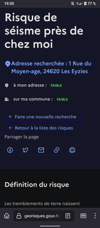 Mes chers lecteurs, J'ai réussi à retrouver une trace de la faille sismique sur laquelle le château de Tayac et le Musée National de Préhistoire des Eyzies de Tayac sont construits. Une faille qui avait été jugée "peu active" par le Bureau de Recherches Géologiques et Minières, je suppose, pendant la phase d'étude du projet de construction du nouveau MNP, dans les années 80, je crois. Donc, le risque sismique est connu, et jugé faible de nos jours. De nos jours, il est jugé faible, par nous. En 1083, quand la moitié de la ville de Poitiers et la cathédrale Sainte Radegonde on été détruites par un gros tremblement de terre, les gens de la region ne trouvèrent cependant peut être pas que ce risque était "faible". Bien sûr, je n'habite pas aux Eyzies de Tayac, mais il fallait le prétendre pour obtenir ce document d'évaluation des risques géologiques aux Eyzies. Et contrairement aux préjugés naïfs de certains, le fait qu'un bâtiment soit construit sur le rocher n'est pas forcément un avantage parasismique. En effet, l'énergie d'un séisme risque d'être mieux transmise à un bâtiment par un sol rigide que par un sol souple, dans lequel elle peut se dissiper en grande partie. Le fait de construire sur le rocher peut donc être au contraire une raison supplémentaire de prendre des précautions parasismiques. Et maintenant, examinons certaines conséquences possibles des séismes, par exemple, la chute brutale de plusieurs centaines de mètres cubes de roche sur des bâtiments ouverts au public et situés immédiatement sous une haute paroi calcaire, présentant par endroits un important porte à faux. Il est difficile de dire quand ça arrivera, mais une chose est absolument certaine, ça arrivera tôt ou tard ! Je pensais avoir publié ici un historique des séismes anciens. Je vais vérifier, mais je le republierai de toute façon, plus un historique des séismes récents, et il y en a un gros paquet... ☺️