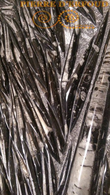 Nos artisans ont apporté le plus grand soin et leur savoir-faire ancestral lors de son extraction, de sa taille et de son polissage en mettant en valeur les ammonites et les orthocères qui le composent.