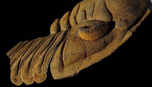Angle génal droit de Guichenia dufouri (llandeilo) x 3 env. / Zone oculaire, suture faciale, angle génal.