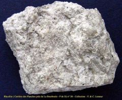 Roche massive, claire, sans phénocristaux apparents. Le dyke est injecté dans un dôme de trachyte (affleurements trachytiques de la vallée de la Cère) 3 cm x 5 cm env.