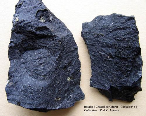 Basalte porphyrique à plagioclases, olivine (cristaux jaune/vert) et augite (cristaux noirs). Structure microlitique. Roche mélanocrate, massive, à phénocristaux visibles d'augite et d'olivine. Lave très fluide. Spécimen prélevé sur une cheminée déchaussée par l'érosion. Système du "basalte des plateaux" recouvrant la brèche andésitique et la labradorite de l'Héritier. Datation : Villafranchien. (3 cm et 5 cm env.)