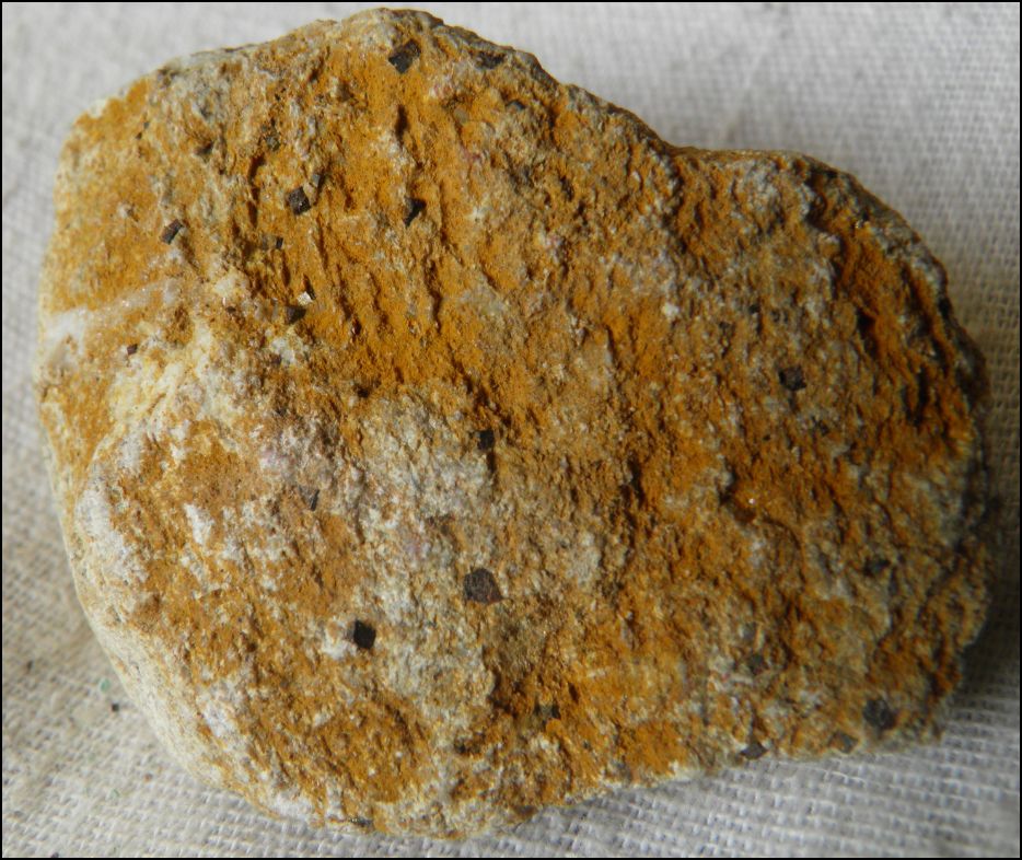 après les crottes de mouches, il a fallu que je trouve un terme pour désigner ce "caillou", c' est le premier qui m' est venu à l' esprit (rapport au goliath dans "ma collection". Je ne collectionne pas vraiment les "grains de sable" et c' est pour cette raison que je n' en note pas la localité, j' ai eu tort cette fois: le minéral jaune paraît être lui aussi intéressant, ce n' est pas un oxyde de fer...Les petits cristaux cubiques sont disséminés tout autour de la pièce et cela n' a l' air ni de pyrite, pyrrhotite,ou galène encore moins fluorite.