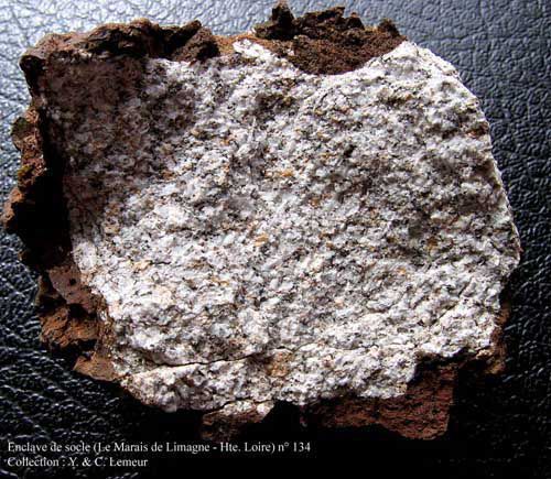 Xénolite de roche granitique (6 cm environ) issu du socle, dans un magma basaltique légèrement bulleux ; projections du maar basaltique du Marais de Limagne