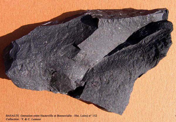 Basalte mélanocrate compact, très dur, sans phénocristaux visibles mis à part quelques cristaux d’olivine. (3 cm x 5 cm env.)