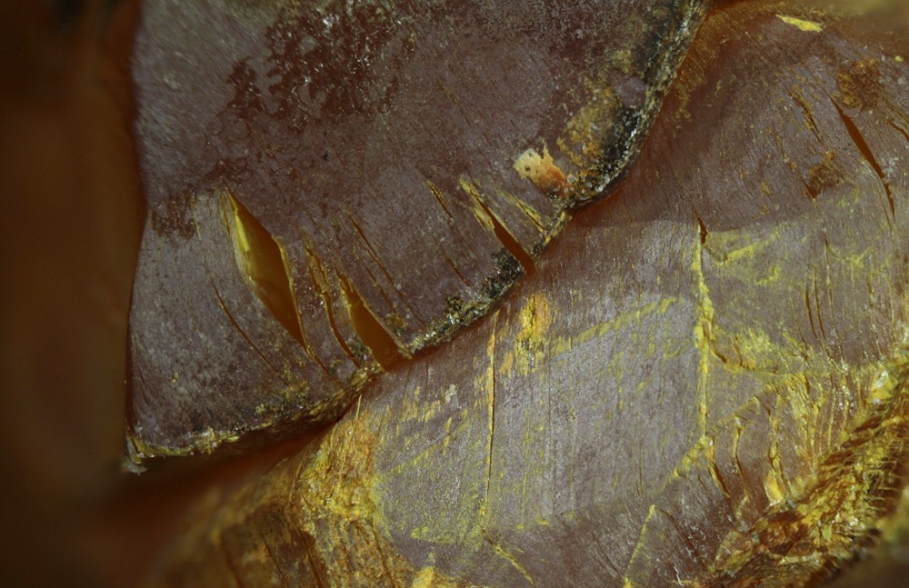 Voici qui devrait être plus facile. C'est un échantillon d'orpiment que j'ai racheté suite à un décès. Je n'ai plus de moyen de remonter à l'origine, et j'aimerais bien savoir d'où il vient. Voici quelques photos pour aider. Une vue d'ensemble, l'échantillon fait 6 ou 7 cm de large. Ensuite, une photo de détail de cristaux périphériques qui ont commencé à se dégrader et ont pris un aspect de millefeuille en train de se délaminer. Il y a également d'autres minéraux sous forme de petits cristaux épars (barytine, stibine) et de masses botryoïdales (calcédoine?) Qu'en pensez-vous? (dernière photo: doublon que je n'ai pas su effacer!)