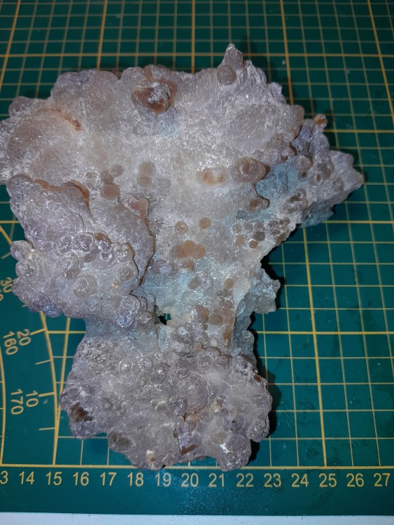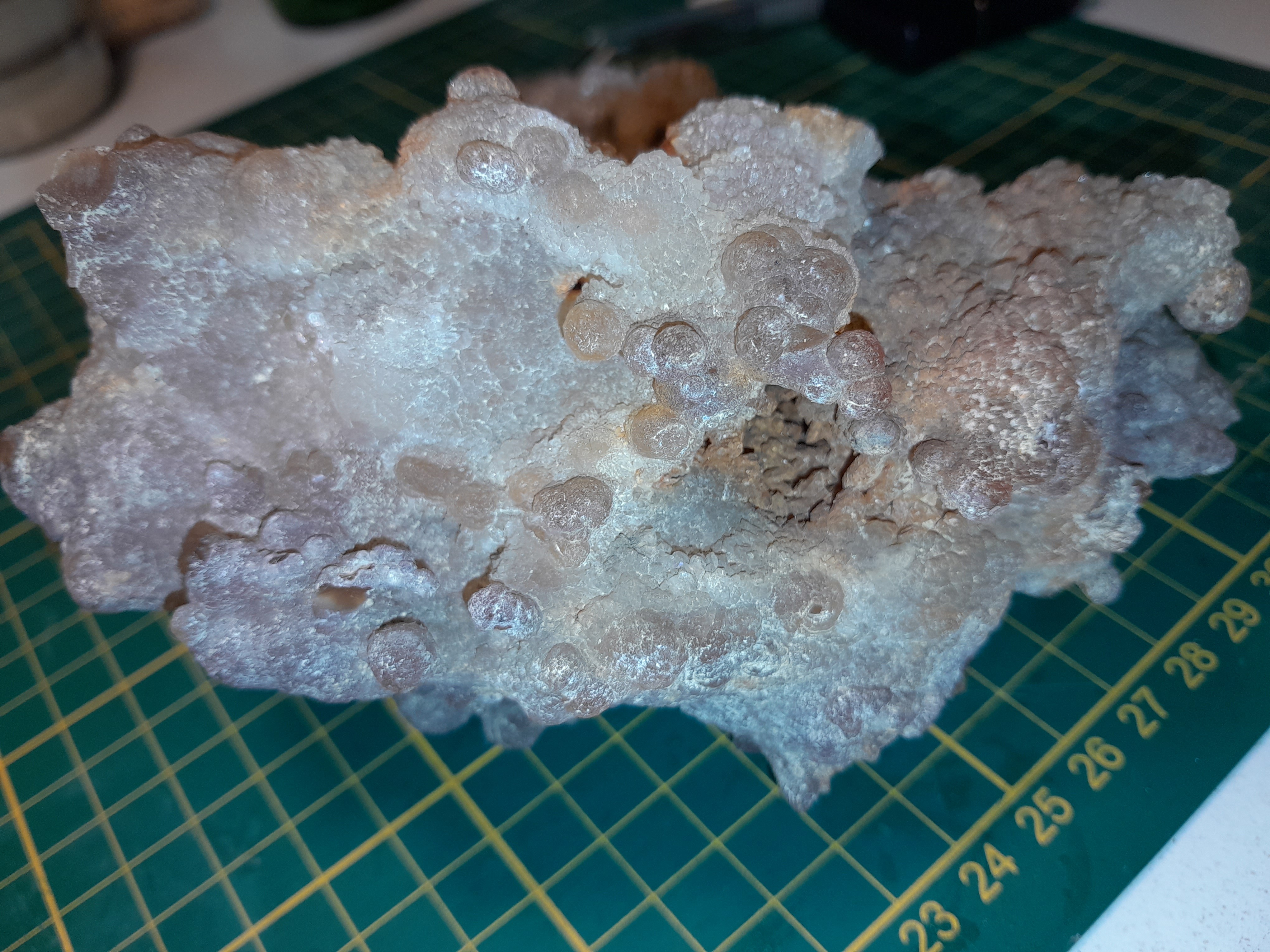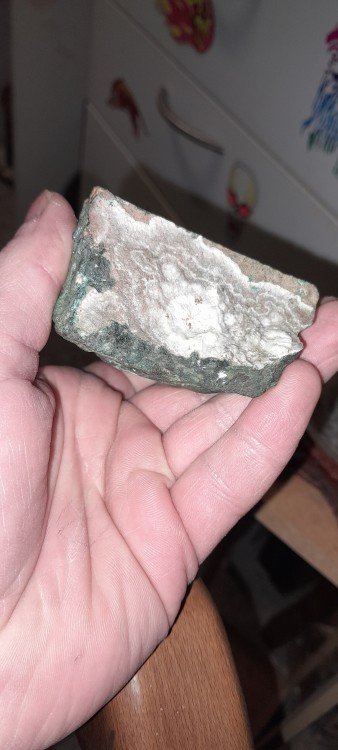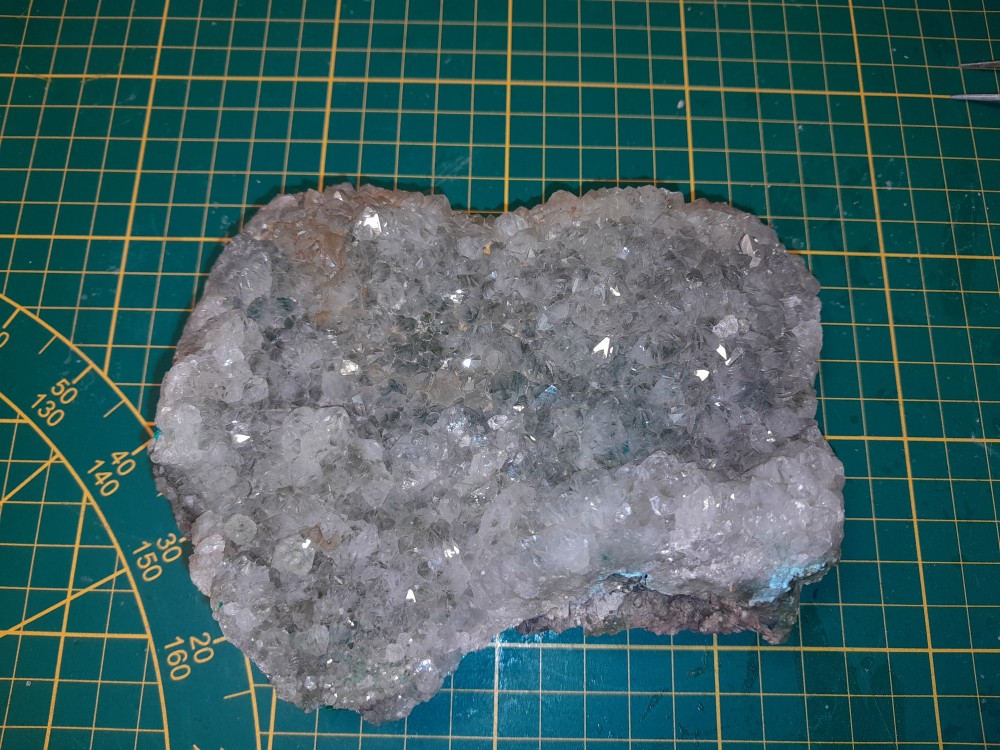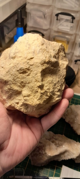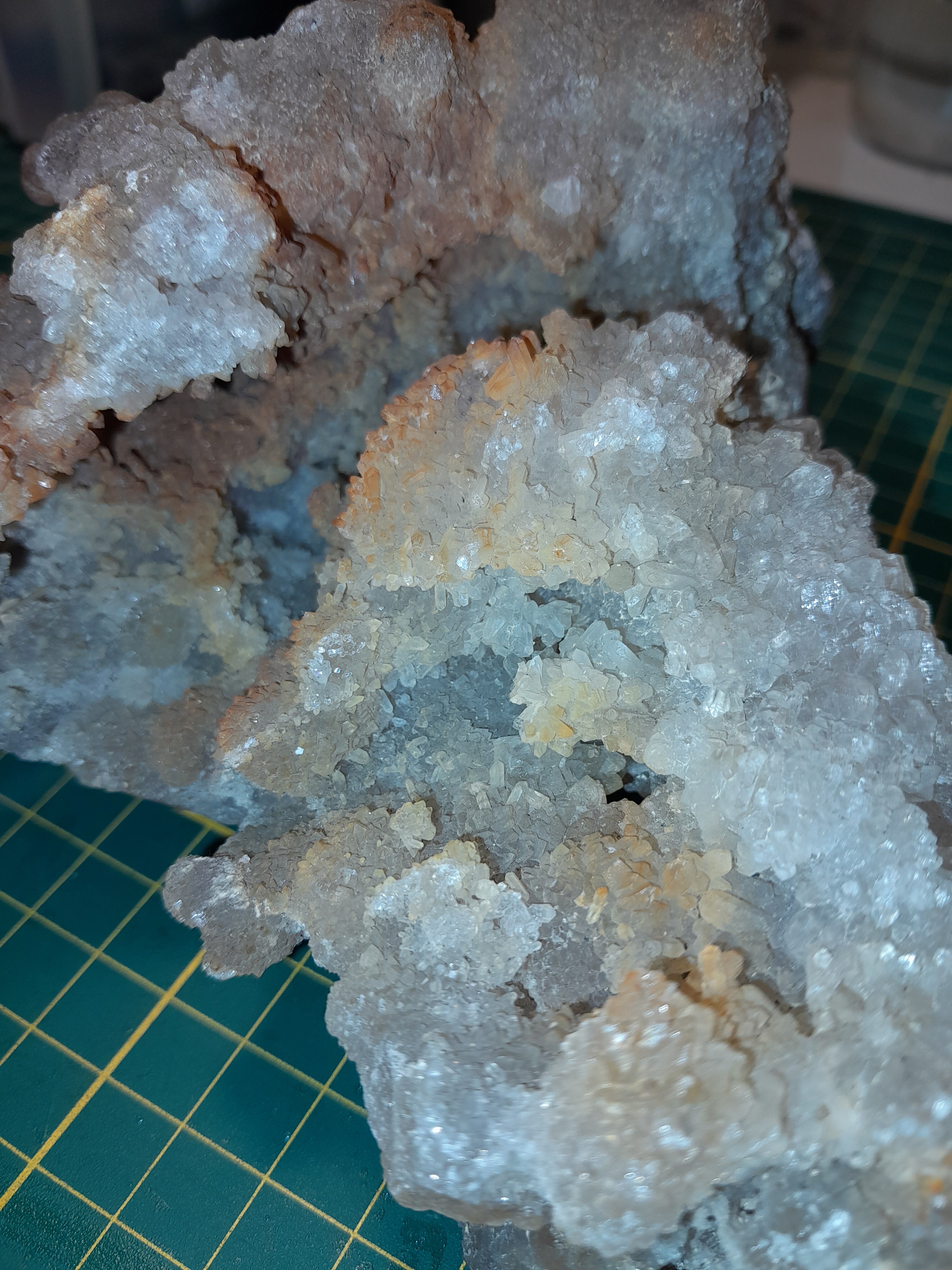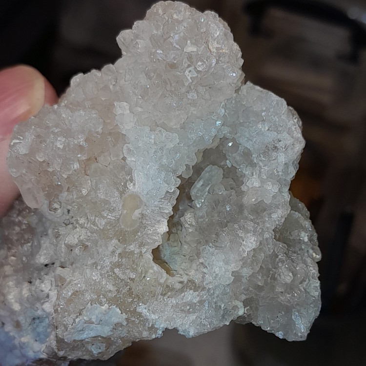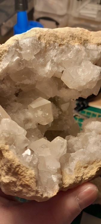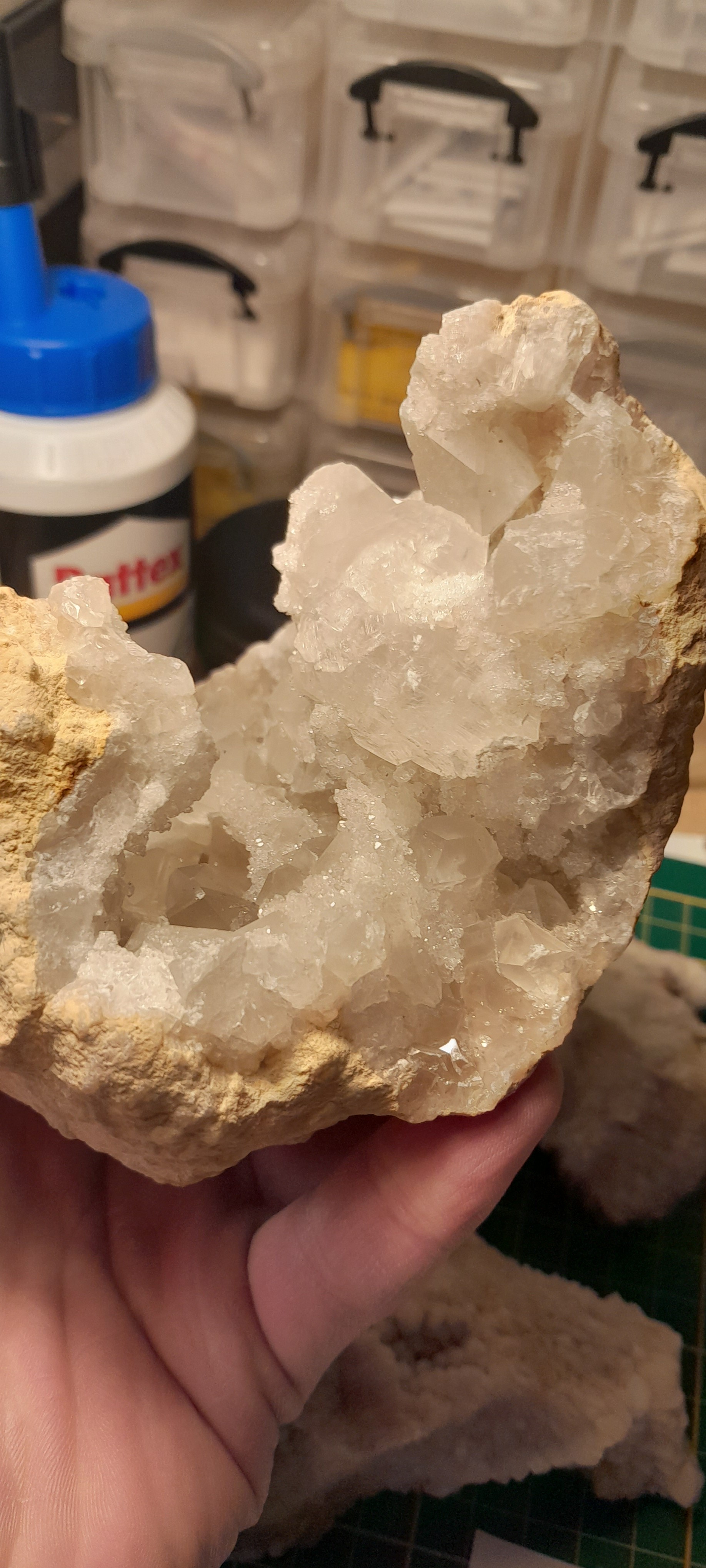 Bonjour , voici une geode , j'ai cru au départ à de la calcite , mais j'ai trouvé une correspondance avec celestine blanche , à votre avis, je n'ai pas la provenance. Merci à tous
