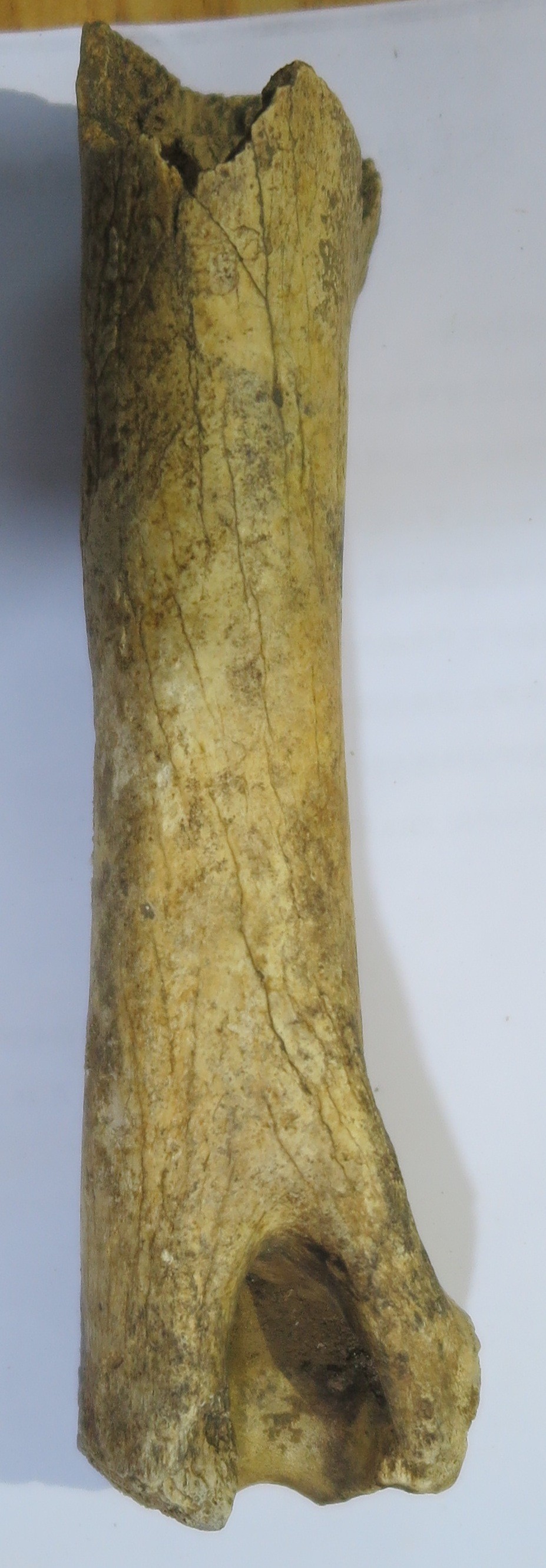 C'est pas une vache. Toutes les photo que j'ai pu trouver sur internet pour l'humérus de vache... ça ne colle pas. Pas du cheval non plus. Trop gros pour du mouton, de la chèvre... C'est quoi alors... Peut-être du buffle (il y en a plus que de vaches dans le coin). Mais comment savoir ? -
