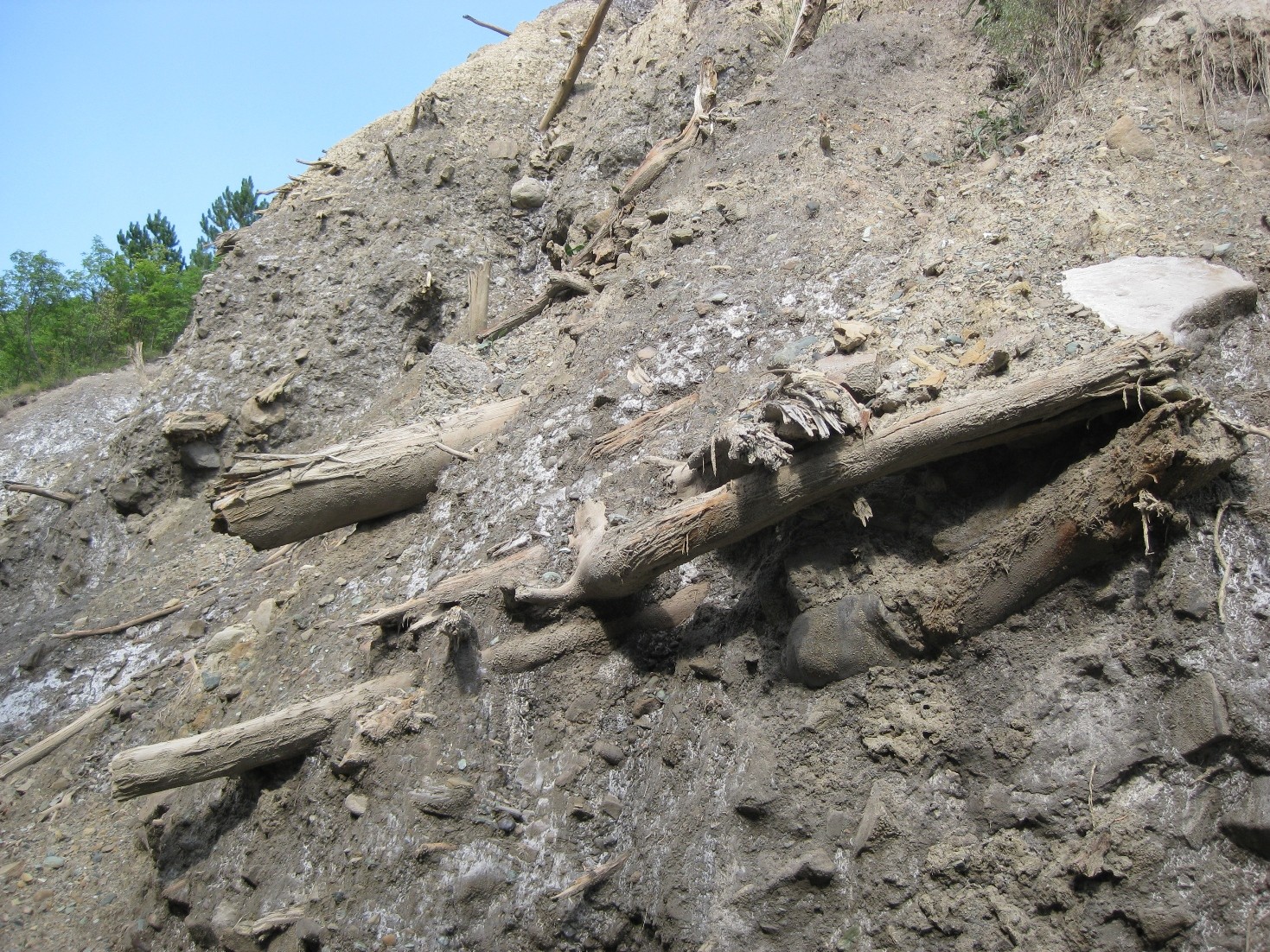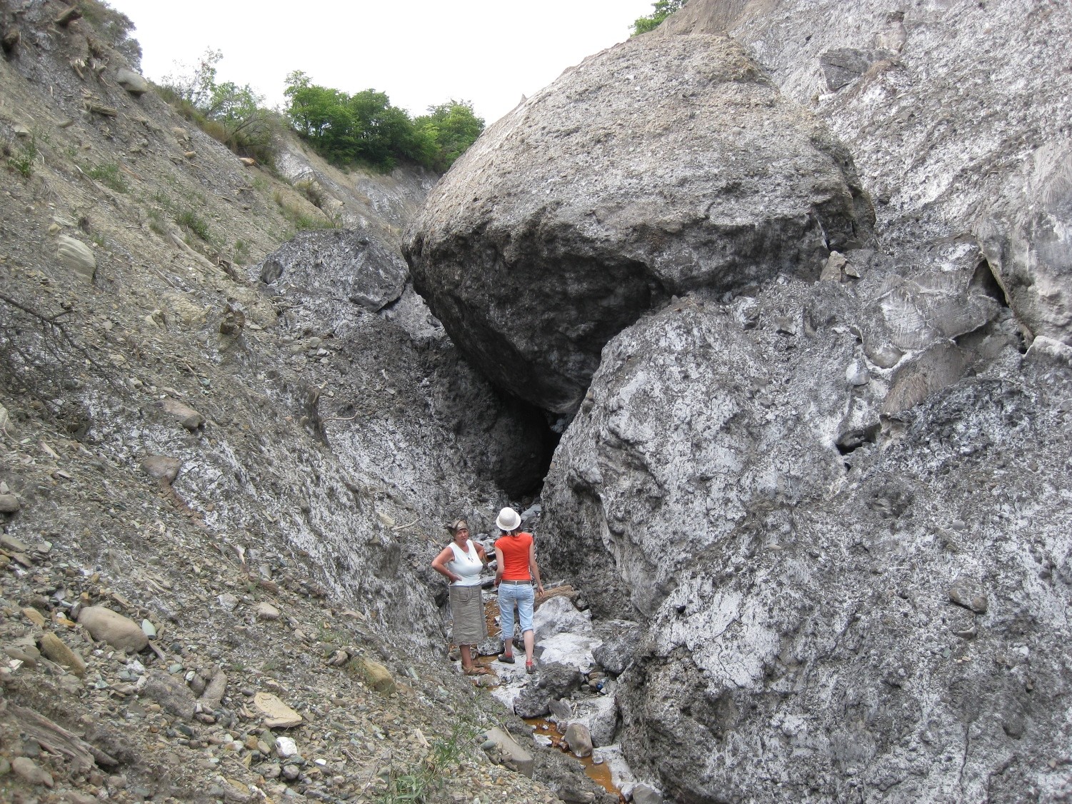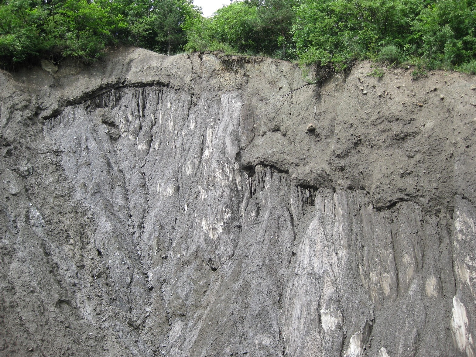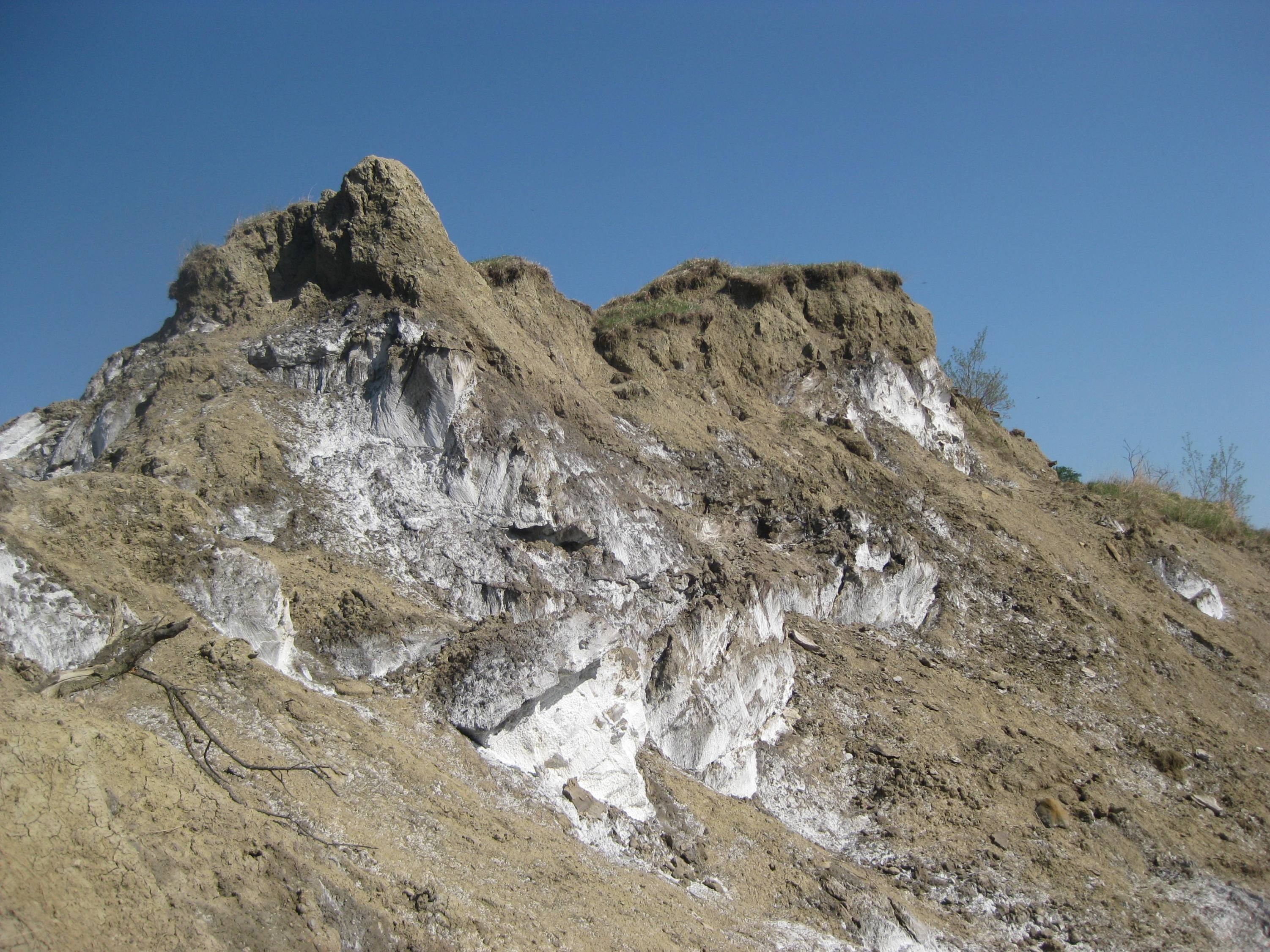Bonjour Jean-François, Décidément nous sommes dans l'époque de la géomorphologie par Street View! Bientôt ce sera la géologie par drones munis d'un petit grappin qui prélèvera des échantillons sur le terrain! Y a t il beaucoup de quartz ? Les grains font ils effervescences (pour ça il faut bien observer). Non, parce qu'après avoir remis de l'acide sur des grains déjà détachés par l'acide, il ne se passse rien. Le couteau a t'il été rayé quand tu l'as planté? J'ai frotté fort un morceau du bloc en question, que j'ai ramené à la maison, contre la lame d'acier inoxydable du couteau, il se raye. Cest nettement moins visible sur l'acier oxydable d'un lame d'Opinel, mais il on voit quand même de fines rayures. Une autre photo intéressante, mais on ne voit pas de pendage, et qui mérite d'aller voir sur place, le sel est en dessous de cette formation brune et semble être aussi au dessus. J'ai trouvé dans mes archive cette formation brune vue sous un autre angle. La route n'était pas encore goudronnée. Le bloc de grès, sujet du post, est loin derrière le bois du pins du bord de la route. Je vois qu'il y a des lacs sur ce plateau. Sont-ce des lacs d'eau douce? Il y a 2 "lacs" (disons étangs, c'est plus réaliste) et beaucoup de petites mares, tous d'eau douce, avec des roseaux, différentes plantes aquatiques et même des grenouilles. En voici une par exemple: On aura donc des produits de l'érosion de ce bloc perchés ( demoiselles coiffées, cheminées de fées). Un dépôt post évaporitique donnerait aussi les mêmes résultats. C'est une inversion, car les points bas au moment du dépôt, se retrouve en haut. Oui, c'est ça le principe. Autres exemples: -------------- Mais en fait c'est un peu plus compliqué, à mon avis. D'abord il faut d'abord être bien conscient qu'un surface de sel ne peut pas exister longtemps à l'air libre dans cette région, sa vitesse de dissolutin étant de l'ordre de plusieurs centimètres par an. Par exemple, dans la même région, la "montagne de sel" de Slanic qui avait 20 ou 30 m de haut a disparue en quelques dizaines d'années. Quand on parle d'échelle de temps géologiques, ça équivaut au temps d'un battement de paupière dans notre vie. Il est est donc extrêmement improbable que nous puissions voir par hasard des parois de sel tout autour et à l'intéreur de plateau Meledic. La cause de ce phénomène est l'homme. Mon idée est que, après leur formation il y a 23 Ma, ces couches de halites ont été recouvertes par des étendues de roches sédimentaires variées. D'autant plus variées qu'elles ont été recouvertes par une nappe de charriage venant de l'ouest. Pendant le même temps, des volumes de sel plus ou moins fractionnés ont progessivement migré vers le haut en fracturant les couches au-dessus. L'érosion par inversion des relief à duré des millions d'années parce que les évènement d'érosion ultra-rapide par dissolution étaient très locaux et éloignés dans le temps. Il en est résulté une couverture de brèche argileuse qui protégeait le plateau de l'érosion et recouvrait les pentes de son pourtour. Maintenant elle ne recouvre que les parties de plateau ayant des pentes faibles, mais pas partout. En effet on voit partout à Meledic une épaisseur très variable de brèche qui recouvre la surface souterraine du sel. (ici le sel a une couleur grise au lieu de blanche parce qu'il est sali en surface par l'argile du haut entraînée par la pluie) Cette brèche contient des blocs de roche de différente nature qui sont des restes des couches disparues. ------------ -------------- ------- Cette brèche argileuse est peu perméable, les mares sont remplies par l'eau de pluie. Elle protège le plateau de la dissolution. L'eau qui percole sans doute à travers cette brèche ne dissout que très lentement la surface du sel (en petite quantité l'eau se sature vite et alors ne dissout plus le sel). Le relief restait donc relativement stable. La poussée du diapir de sel compensait l'érosion lente et maintenait le plateau à 200m au-dessus de la vallée du Slanic L'arrivée de l'homme civilisé dans la régin provoque une crise morphologique par l'abattage de le forêt originelle (dont il ne reste qu'un lambeau dans un endroit presque inaccessible). D'après des témoignages oraux, il y a eu un abattage généralisé de la forêt au début du XXième siècle. Ces troncs d'arbres plantés dans le versant opposé à la pente Ouest du plateau en témoignent. Je pense qu'il y a eu un énorme glissement de terrain qui a dénudé la pente et accumulé les arbre à son pied. Depuis, un ravin s'est creusé et les a laissé suspendus. Ils sont bien conservés par le sel qui les imprègne. ---------------- Ici en plus un voit bien au second plan l'épaisseur de brèche insoluble qui protège le sel Sous le régime de Ceaucescu, un reboisement par des pins à été fait par endroits, mais c'était trop tard pour arrêter l'érosion des marges du plateau. Le paturage est l'autre cause d'érosion d'origine anthropique, à cause des sentiers dénudés créés les moutons et les vaches sur les pentes. La brèche argileuse se ravine d'abord de façon classique, puis quand le fond d'un ravinement atteint une crête souterraine de sel, la dissolution accélère énormément l'érosion. Je n'en dis pas plus plus parce que j'avais commencé ce sujet ici: https://www.geoforum.fr/topic/24192-le-relief-des-zones-a-sous-sol-salin/page/1/#comments