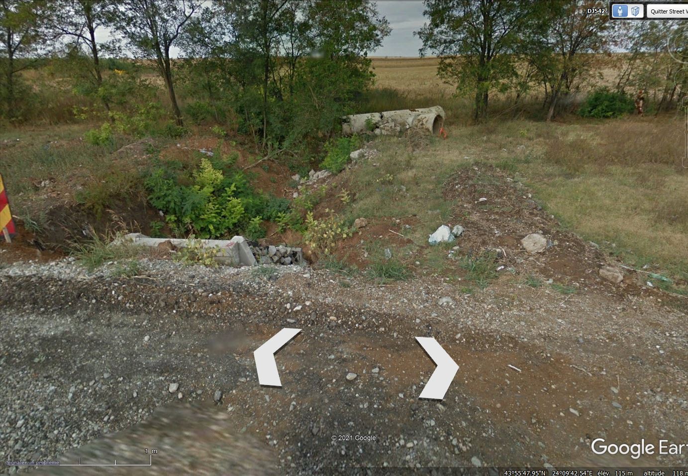 Bonjour , Je ne connaissais pas l'aspect politique de Deliblato. La première phrase du premier lien que tu cites est: "Le Sahara d'Olténie est un désert situé dans le sud de la Roumanie, entre Calafat et Dăbuleni. Le désert couvre environ 800km², soit 6% de la surface du district du județ de Dolj." Dăbuleni se trouve dans la zone que j'ai entourée en rouge, au sud. Le mot "désert" est ici une abus de langage. Comme bien souvent la vérité est déformée pour frapper l'esprit du public. A Calafat il tombe en moyenne 493mm d'eau par an. Les environs sont couvert de de champs cultivés. On y produit aussi des pastèques, qui ne poussent pas sans eau dans le sol. D'un point de vue géomorphologique, il serait correct d'écrire: entre Calafat et Dăbuleni. Les paléo-dunes couvrent environ 800km², soit 6% de la surface du district du județ de Dolj. Une bonne partie de ces paléo-dunes n'ont pas été cultivées. Pour information, la sécheresse dans cette région n'est pas un phénomène nouveau. Pour la contrecarrer, sous le régime communiste un réseau de canaux d'irrigation a été construit, mais le système d'irrigation a été abandonné après la chute du régime en 90. On voit le quadrillage de canaux sur la première capture de Google Earth de ce sujet. Je n'ai pas pris de photos quand je suis passé par là il y a quelques jours, mais voici 2 captures de Street View qui montrent l'état actuel de ces canaux. ---------------------