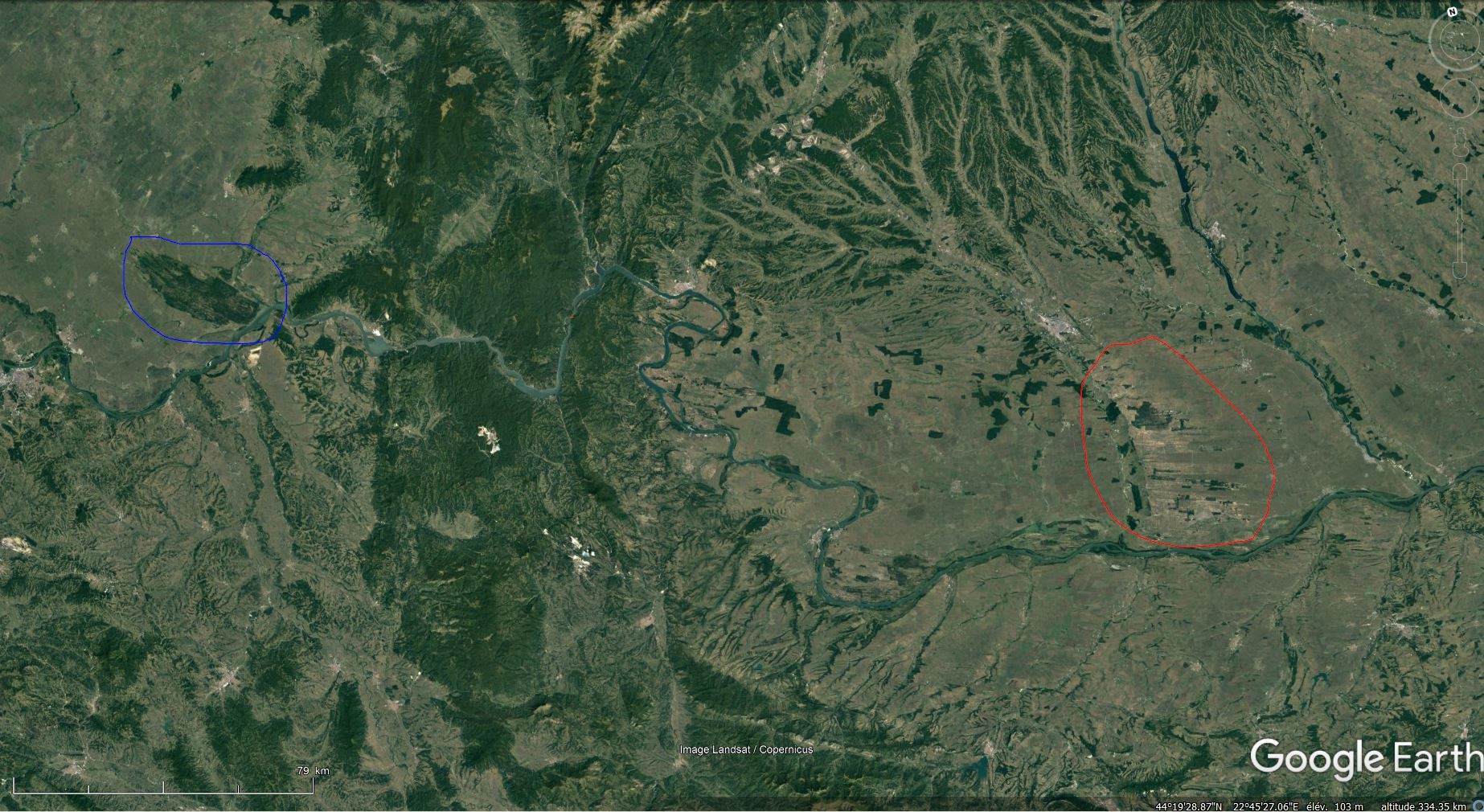 Ça ne m'étonne pas. Personne ne l'imagine. Sauf moi. J'ai l'impression d'être une exception. Parce que dans notre civilisation actuelle, surtout depuis qu'il y a internet et facebook, nos centres d'intérêts sont dirigés. On va là où il est recommandé d'aller, on s'intéresse aux sujets qui animent avec redondance les petits écrans. L'exploration, la remise en question, la découverte par soi-même sont en voie de disparition. Pourtant sur Google Earth la zone claire et striée, que j'ai entourée en rouge sur l'extrait ci-dessous, pourrait éveiller la curiosité. Mais comme personne n'en parle et qu'aucune route goudronnée ne passe juste à côté de ces dunes, personne ne les remarque. Par contre les sujets à la mode comme, par exemple, le delta du Danube sont utra-médiatisés et il y des centaines de sites de tourisme, d'écologie, de politique sur ce sujet et même des scientifiques biologiste, géologues, hydrologues qui y font toutes les analyses et extrapolations possibles. En effet, il y a 250 km de distance à vol d'oiseau entre les deux zones, et la frontière roumano-serbe à traverser . Sur cet extrait de Google Earth, j'ai entouré d'une ligne bleue Deliblato et d'une ligne rouge la zone du Jiu. Ah, oui, Deliblato est devenu à la mode. J'ai même lu sur un autre site: "La dune de Deliblato (Deliblatska peščara) est l’un des derniers déserts d’Europe." Toujours cette recherche du sensationnel. Comment qualifier de désert un endroit où le sol est couvert d'arbres et de d'herbe, et où il tombe 70 cm d'eau par an! D'ailleurs on ne voit pas de surface de sable nu importante! J'avais traversé la zone de Deliblato en 2012, sans connaître son nom. Les trois première photos de mon sujet https://www.geoforum.fr/topic/25299-paleo-dunes-reparties-sur-des-centaines-de-kilometres-le-long-du-danube/?tab=comments#comment-419873 montrent ces dunes. D'ailleurs on en voit d'autres sur les images de Google Earth.