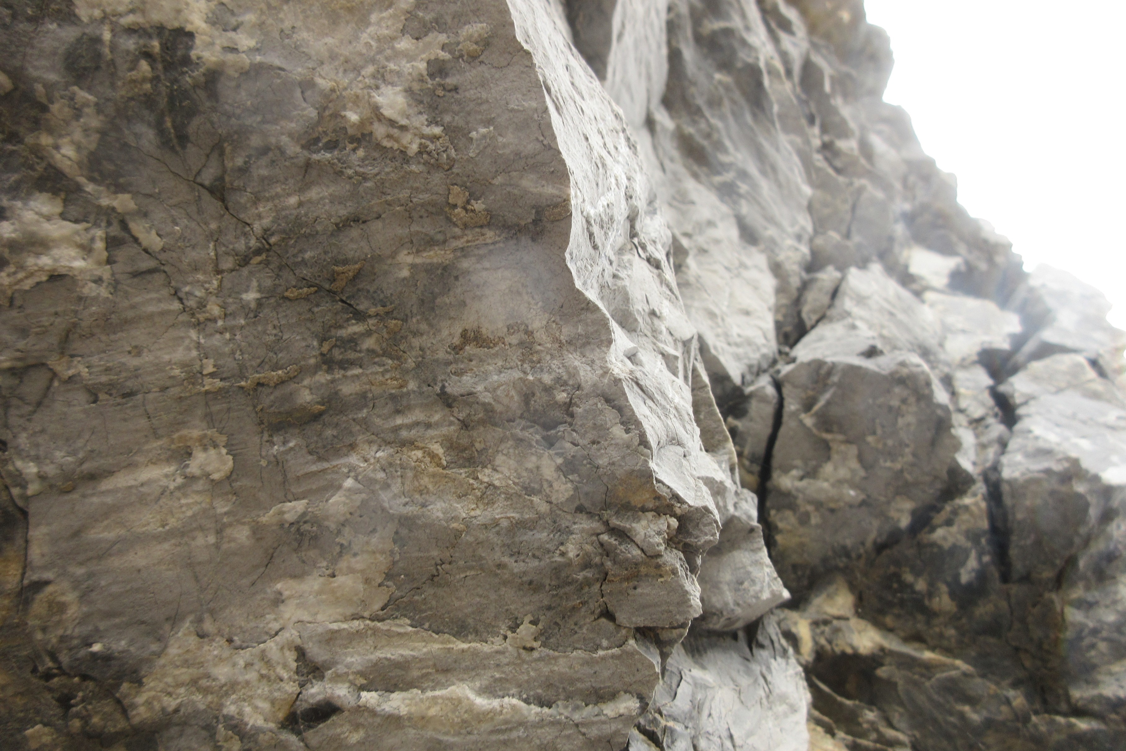 Comme je l'avais prévu dans mon post du 8 septembre, je suis repassé au même endroit dans la défilé des Portes de Fer. (Je ne sais pas comment on trouve les numéros de paragraphes.) On en était resté à déterminer si les discontinuités repérées par Jean-François grâce à Street View sont d'origine tectonique ou s'il s'agit d'une stratification. Pour les discontinuités rapprochées qui pendent vers la droite, on voit des stries qui prouvent bien que ce sont des failles. Il y a donc eu un glissement perpendiculaire à la falaise Ici l'appareil est dirigé verticalement vers e haut: Ici j'ai photogrophié de près un caillou ramené à la maison, dont une face était une faille. ll y a beaucoup de calcite sur ces plans de faille. Ici elle forme une couche particulièrement épaisse. Maintenant au sujet des gros bancs de gauche, en général je n'ai rien observé de particulier, mais par endroits on voit quand même des stries: Dans ce cas le déplacement s'est fait dans un plan proche de l'horizontale, et parallèlement à la falaise, c'est -à-dire orienté à 90° par rapport aux failles rapprochées qui sont à côté, à gauche, et montrées sur les photos précédentes J'ai regardé ici: http://www2.ggl.ulaval.ca/personnel/dkirkwoo/module06/module06.html#1 Entre autres on y lit: 6.2 Caractéristiques physiques des failles Physiquement, une faille correspond soit à une surface irrégulière souvent ondulée et rugueuse ou à un corridor de déformation variant de quelques centimètres à quelques centaines de mètres de largeur. Le plan de faille est en fait un plan de cisaillement ou de glissement. Les zones ou couloirs de failles correspondent à des couloirs de déformation au sein desquels se développent plusieurs éléments structuraux secondaires tels que les fractures de cisaillement et d'extension, les failles secondaires, les plis et les plans de clivage. 6.2.1 Les couloirs de failles Une faille et ses zones bordières font généralement partie d'un corridor de déformation beaucoup plus vaste qui contient de nombreux plans de rupture. Ce corridor de déformation possède une dimension allant de l'ordre du centimètre jusqu'à quelques centaines de mètres de largeur et est souvent fonction de l'importance du déplacement relatif des compartiments de part et d'autre. On est bien ici en plein dans un corridor de déformation. Le toit de la faille a été déblayé par le Danube et le couloir de déformation affleure sur une grande hauteur, sous forme de falaise dans dans cette zone, d'autant plus qu'ellle a été retaillée à la base par la route. On a donc un chaos de plans de failles de diffréntes orientations. J'ai pris encore cette photo qui le montre: Et celle-là où on voit un miroir de faille arrondi qui forme des protubérances: Enfin j'ai une question. Ces filets de calcite dans les gros bancs dont il est question plus haut sont-ils générés par une fissuration due justement au compressions et déformations qui se produisent dans la couloir de faille? -