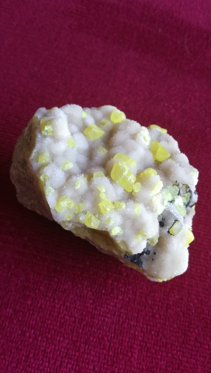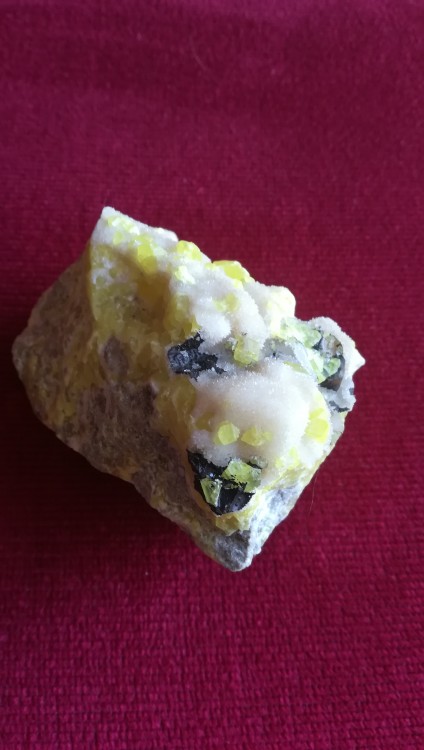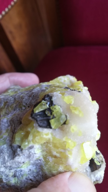 bonjour, tout est dans la question cristaux de soufre (SICILE) avec aragonite (sauf erreur de ma part) MAIS avec partie minerale noire qu est ce svp ? Michel