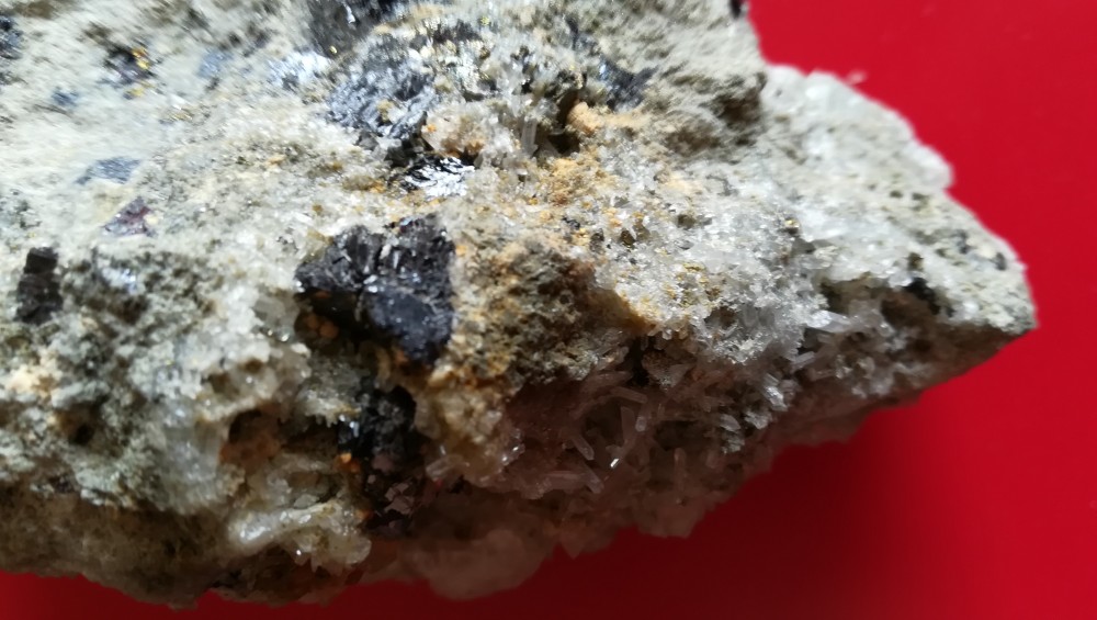 re bonjour Effectivement pas d effervescence par contre dans la gangue ,presence d un mineral noir (tres reflechissant) , apparemment en feuillet (loupe necessaire) ......... mica ? plus precisement : muscovite ? lepidolite ? ...... tres noir ??!! merci pour vos avis -