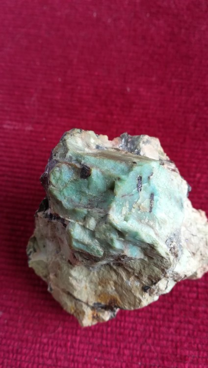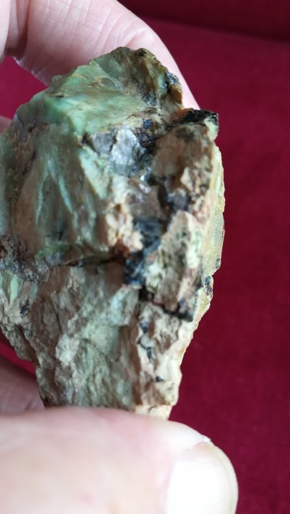 Bonjour, Recuperée tout recemment cette piece avec vielle" etiquette pyrom. ussel " forte densité (mais qui vient de la matrice a mon avis ) Trace blanc verdatre Aspect botroidal (mamelonné) Je veux bien la mettre dans ma vitrine mais je souhaite etre sur de l identification (pas de confusion avec adamite ???) merci michel