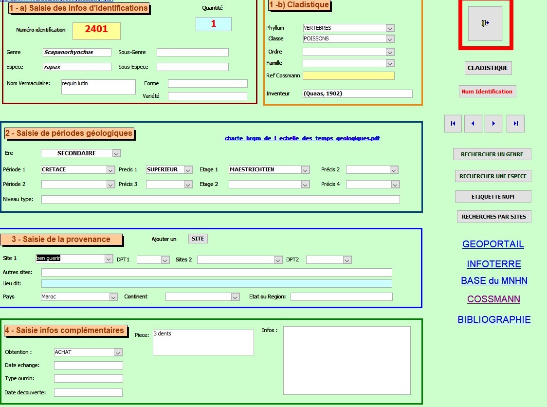 Si l'on peux faire un test avec une partie de ma base Access ce sera avec plaisir, reste ensuite à définir un formulaire dédié aux fossiles, je met l'exemple de mon formulaire ou les champs principaux sont représentés et regroupés sur un formulaire, avec liste déroulante, et au besoin une macro pour entrer un nouvel élément.