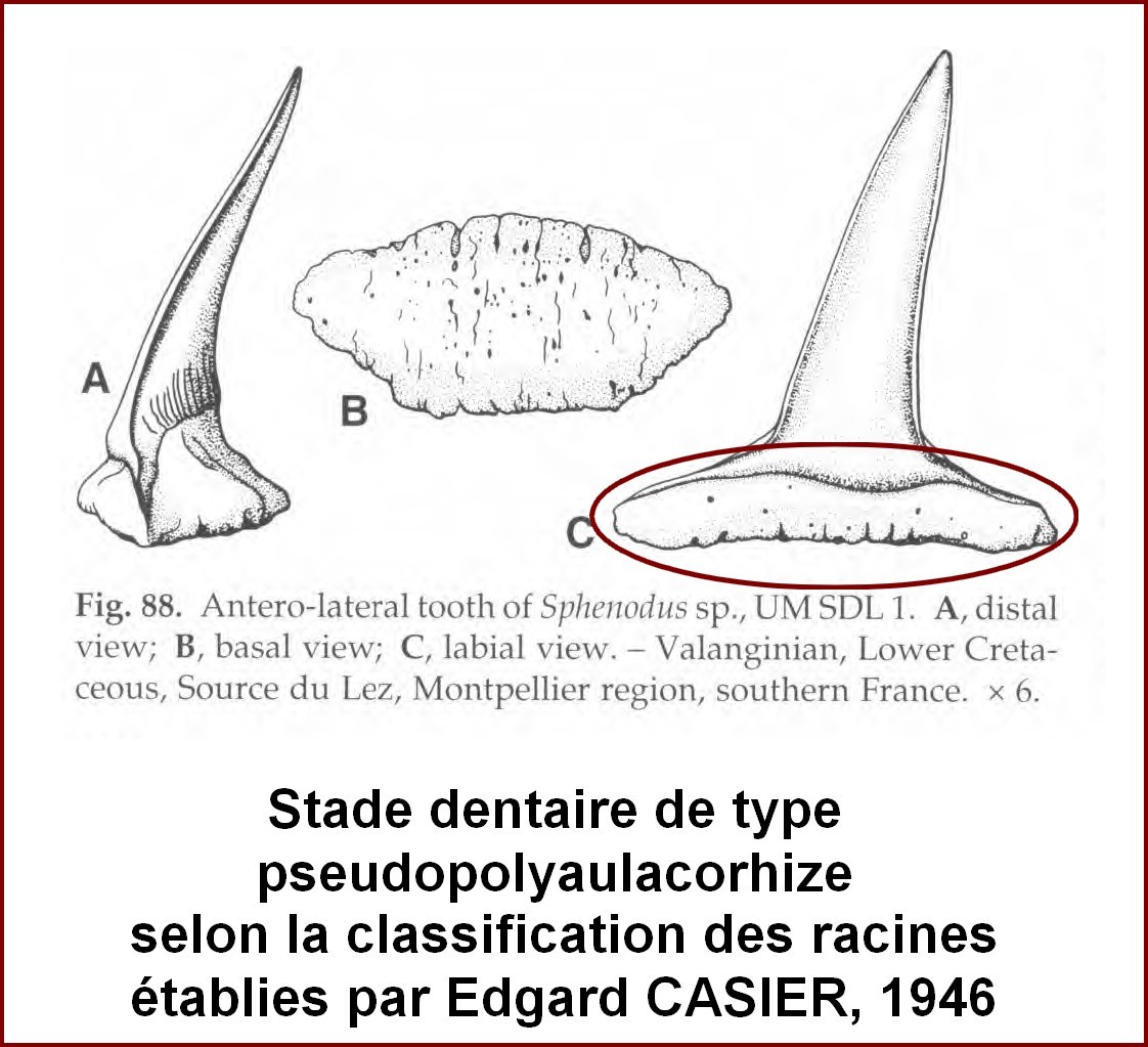 Cependant pour être certain de son rattachement à ce genre, il est toujours préférable d'avoir une racine avec le reste de la dent, cette racine chez le genre Sphenodus est caractéristique, voir schéma ci-dessous, désolé pour le nom barbare qui est associé à son stade racinaire.