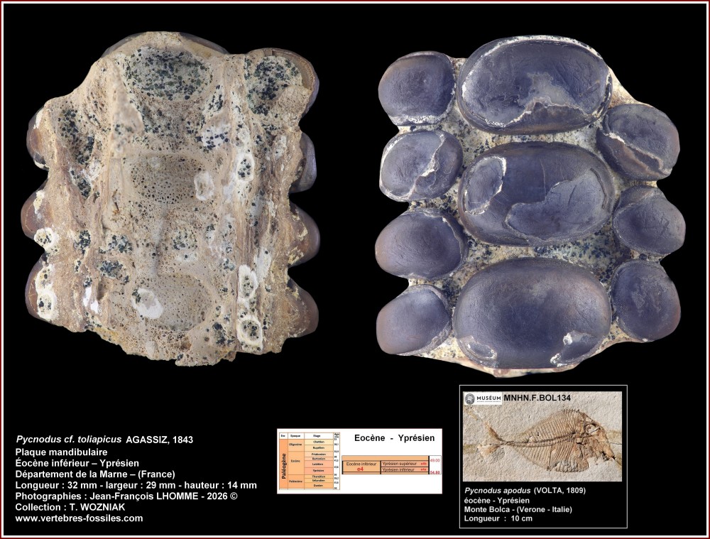 Habituellement les poissons Pycnodontiformes sont représentés sous forme d'un disque plat ou ovale plat, dans le cas de notre survivant à l'Yprésien, il en va tout autrement, leurs morphologie étant adaptés à des fonds peu profonds, la partie inférieure est aplanie comme sur le Pycnodus apodus de Monte Bolca (Italie) mis en photographie pour vous donner un aspect de la forme globale.