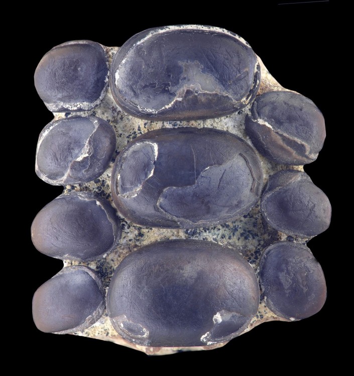 d'un élément central d'une plaque dentaire. Son diamètre maximum (13,5 mm), vraisemblablement antéro-postérieur, est à peine supérieur à celui qui forme avec lui un angle de 90° et qui doit donc être le diamètre transversal. Le contour de la dent est subcirculaire.