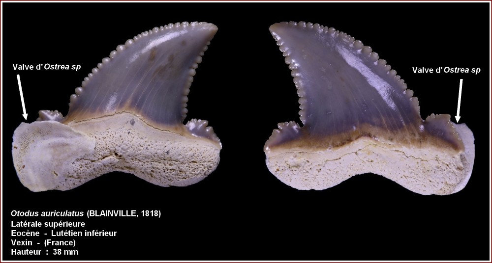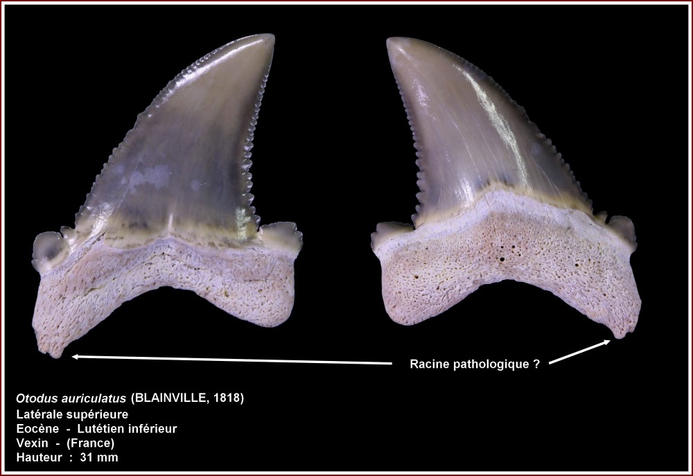Bonsoir Didier Merci pour ce petit rappel, mais personnellement je trouve qu'il est nécessaire de rappeler les règles de nomenclatures, sinon le forum ne pourrait pas jouer son rôle, c'est à dire faire progresser les participants dans leur degré de connaissance. Je trouve plus cohérent d'avoir un genre unique pour la lignée de Otodontidae, le genre Carcharocles n'étant très parlant à mon sens, tout comme l'ancien genre Carcharodon qui lui était totalement incohérent, laissant une appartenance directe avec l'espèce actuelle. Belle dent, provenant probablement d'un ancien site le long d'une petite route, au nord de Pontoise Voici un petit échantillonnage de dents similaires provenant du "Vexin" et une autre que je tiens à préserver telle quelle, tu comprendra aisément pourquoi ? et une autre montrant une petite pathologie au niveau de la racine, récemment un amateur m'a montré une très belle dent avec une pathologie sur le bourrelet lingual assez remarquable, je tenterais de la photographier lorsque je verrais ce dernier. -