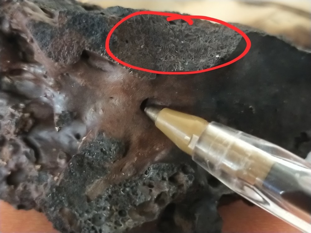 Ça ressemble à une scorie mais le morceau est de belle taille, ça ne vient ni d’une forge ni d’un petit four artisanal.