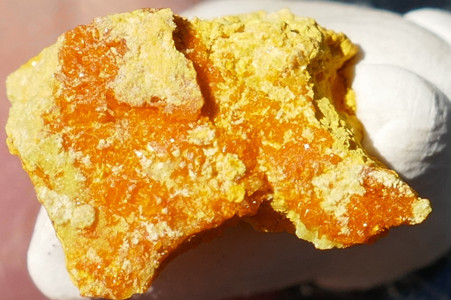 C'est dans un garage aéré et je maintiens un débit de dose de 1,2 uSv/h à 1 m et dans le bruit de fond à 3 m. En Limousin on a un bruit de fond élevé, 3 ou 4 mSv annuel c'est normal sur le leucogranite des monts d'Ambazac. Donc, régulièrement j'en lache ; si il y en a qui rentrent. Mais c'est dur à faire rentrer ces bestiaux. Une rareté : agriniérite de Margnac, site type et pour le moment le seul. Photo macro, mais c'est bien cristallisé en tablettes orange. -