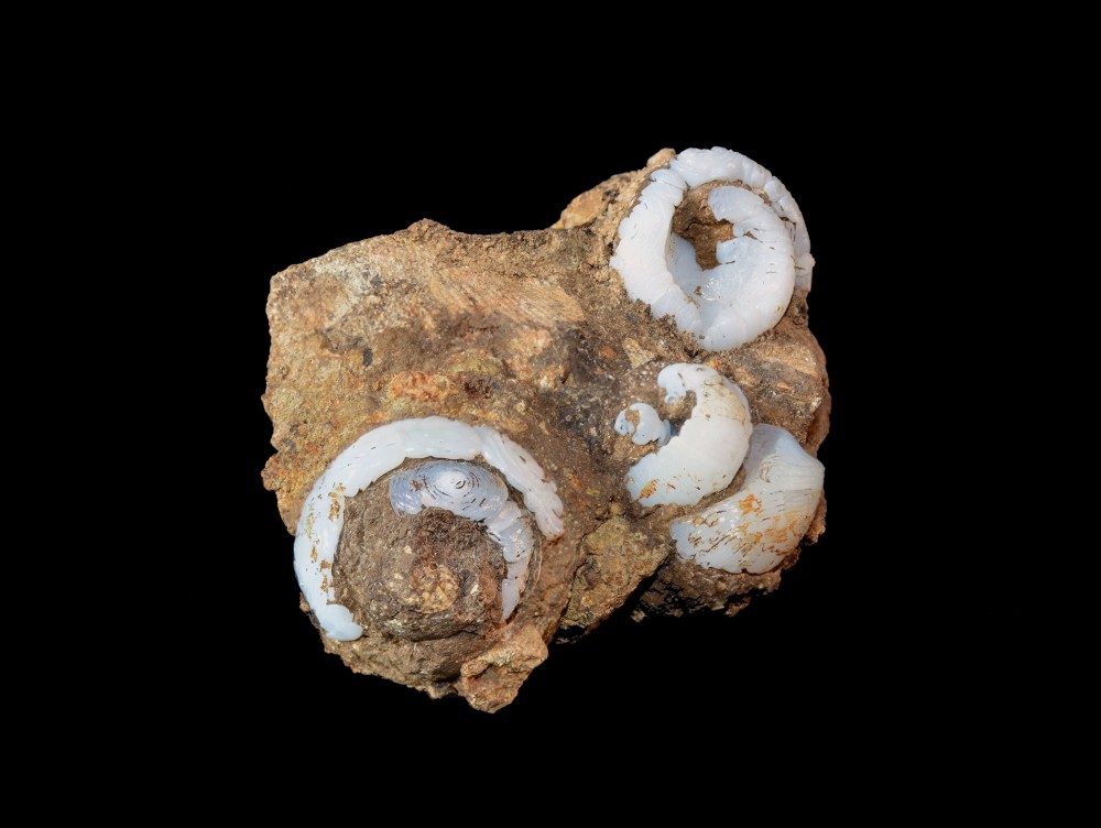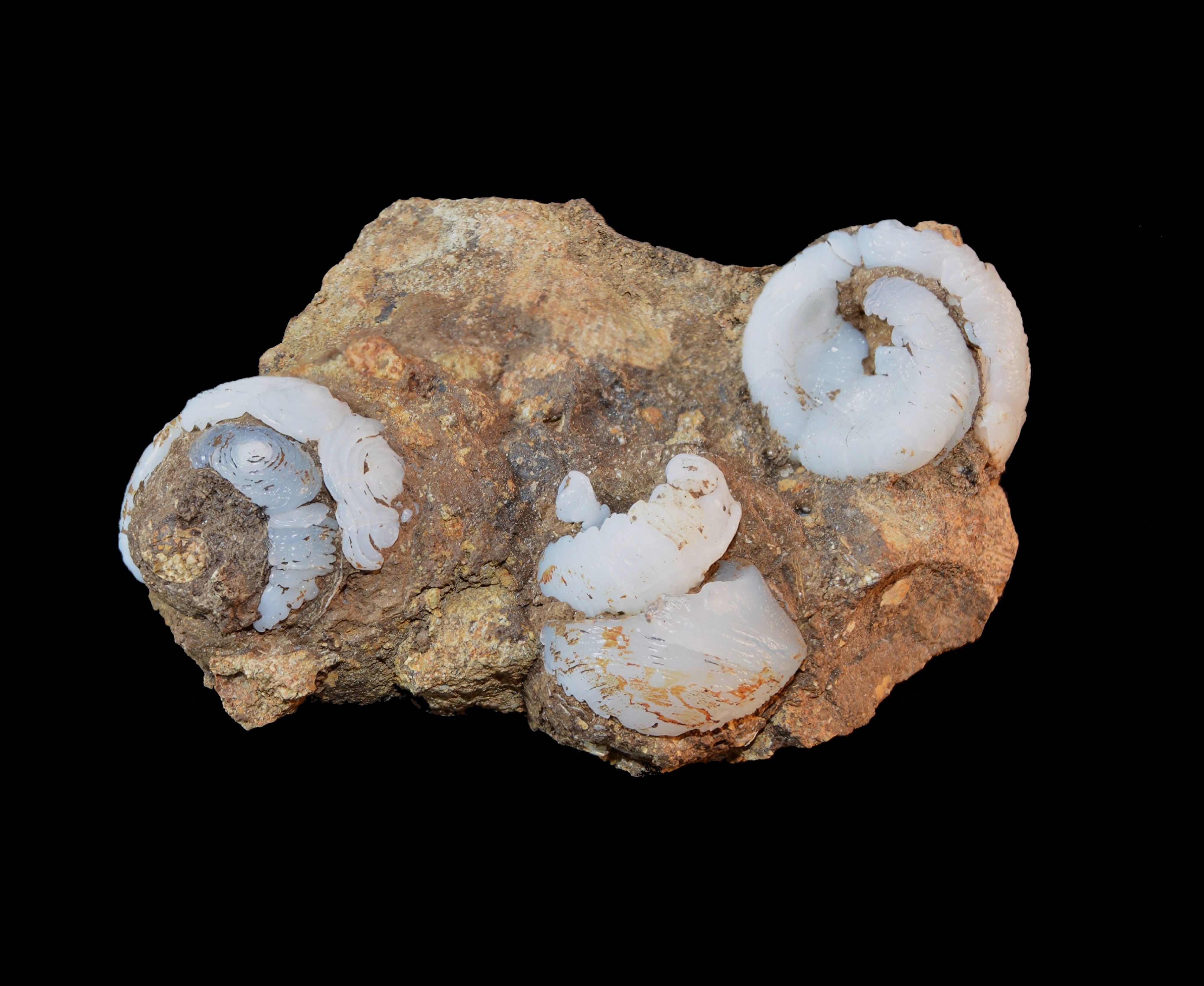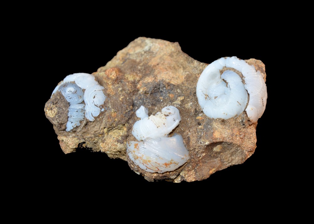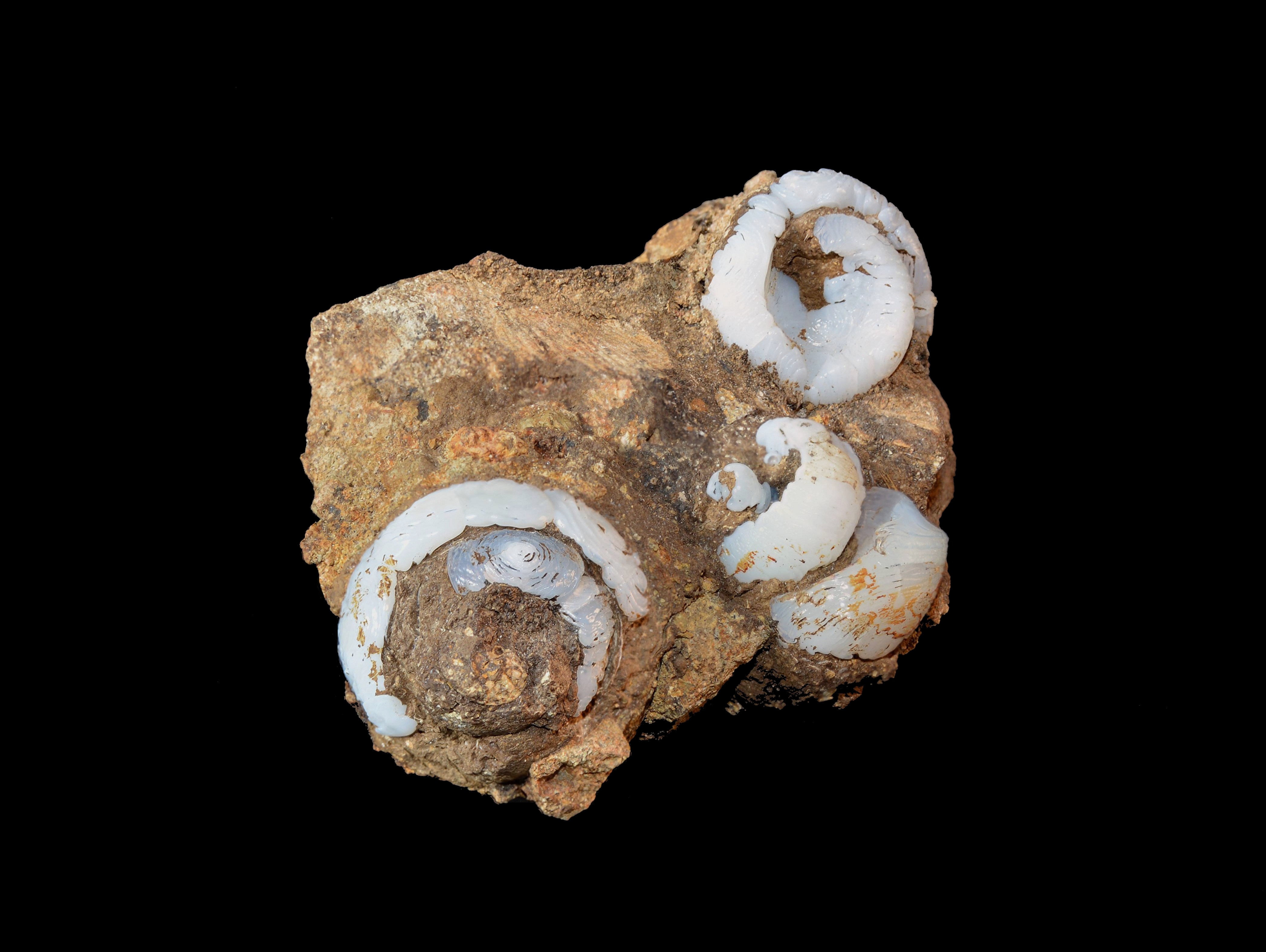 303-Hélix Ramondi (7x4 cm), Mine des rois, Dallet (63). Achat le 01/03/2025 à la bourse de Châtel-Guyon , c'est ma première (et certainement dernière) triplette d'Hélix sur le même échantillon. -