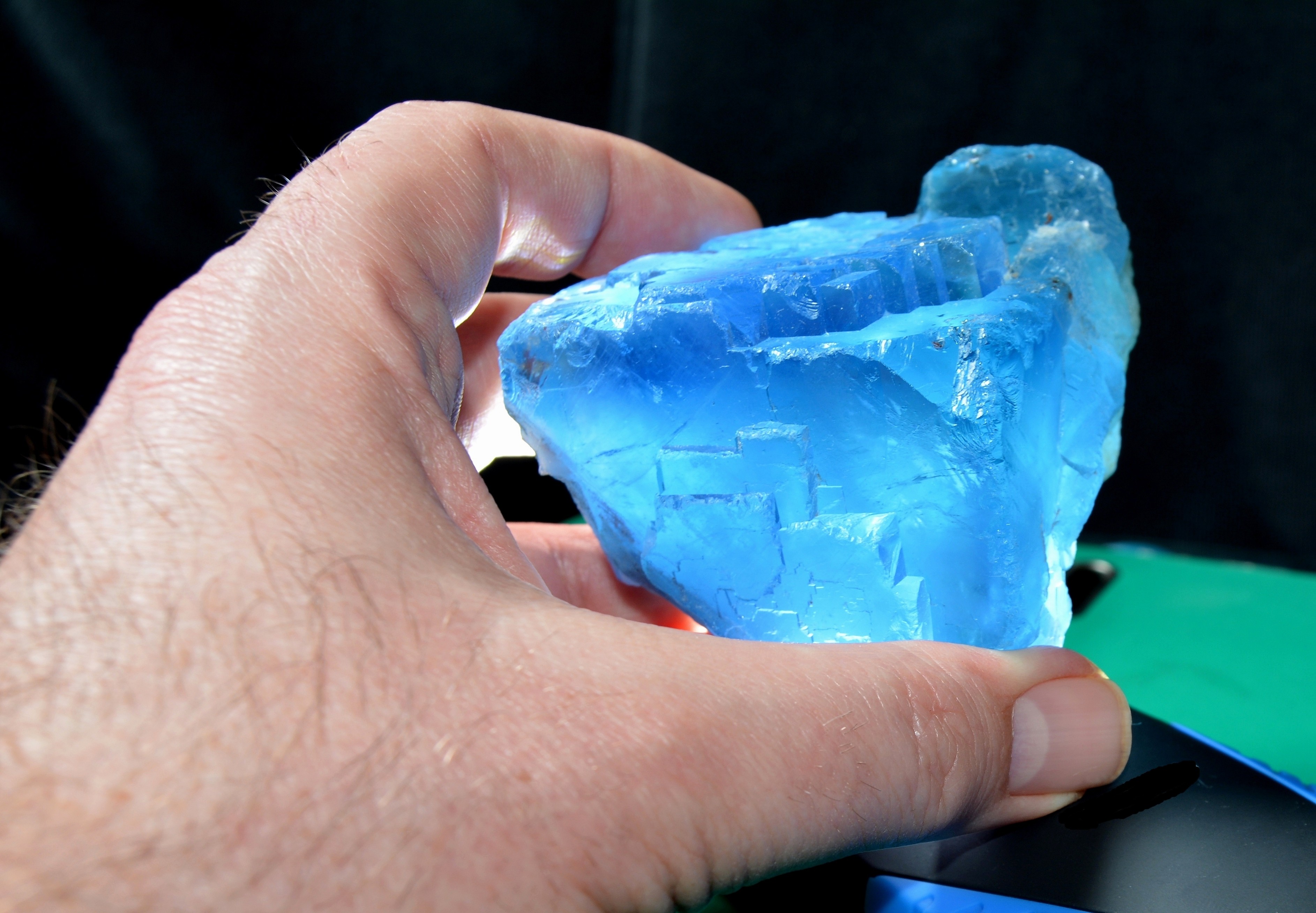 299-Fluorine (9x7cm), Mine de la Barre (63), acquisition le 24/02/2024 bourse de Châtel-Guyon. Celle-là a vraiment été une horreur à photographier (plusieurs dizaines d'essais), la couleur est plus belle en réalité, d'un bleu très sombre. La pierre a été cassée et recollée en son centre, plein de traces de chocs mais gros cube et couleur sympas. -