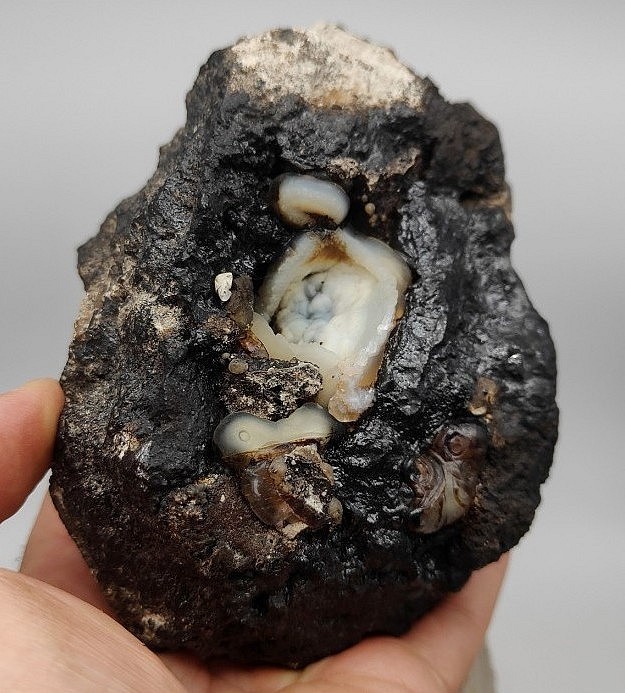 294-Hélix Ramondi en Lussatite (2.2x2.1 cm) Mine des Rois, Dallet (63). Ce spécimen intéressant figure page 69 du Hors-série 21 du Règne Minéral sur la Lussatite, la Lussatite a cristallisé sur l'extérieur de la coquille alors que la plupart des spécimens connus sont des moules internes. -