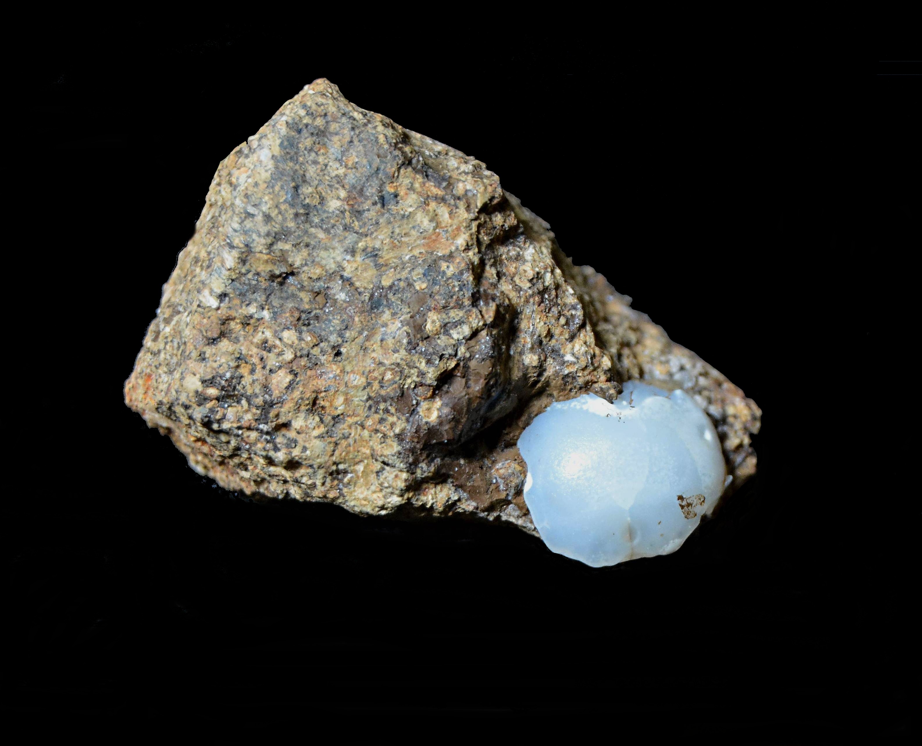 283-Calcédoine (4.3x3.2cm), carrière de Gandaillat (63). Plus que l'aspect esthétique c'est l'histoire de l'échantillon qui a m'a intéressé. Il figure en page 54 du hors-série n°21 de 2015 du Règne Minéral sur la Lussatite. -