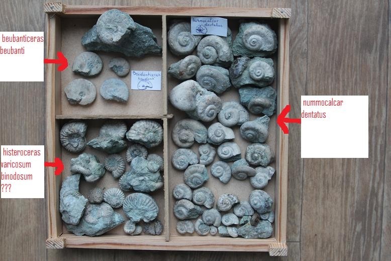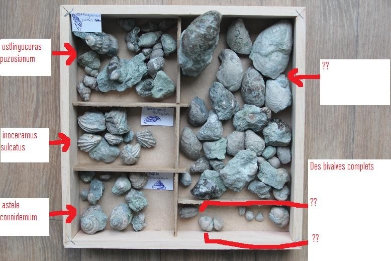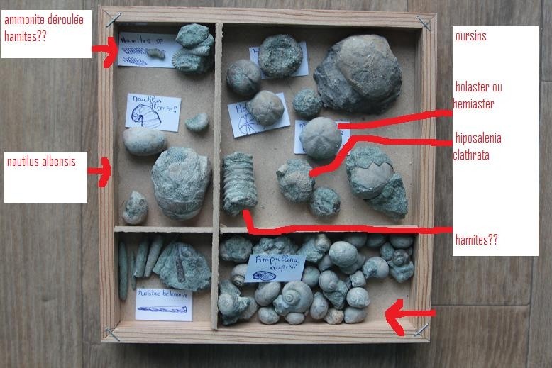 bonjour, J'étiquette ma collection de trouvailles dans les grès glaucaunieux de l'albien (ain) et j'aimerai votre avis. je dépose des photos et merci de me les recorrigées si besoin (sur PAINTpar exemple) j'aimerais aussi une détermination sur la dernière photo : 2 fossiles : celui de gauche : hysteroceras varicosum ou douvilleiceras mummillatum celui de droite : ampullina dupinii (comme le reste de la boite) J'avais un site exactement de cet endroit, mais le lien est brisé !! Merci de vos lumières