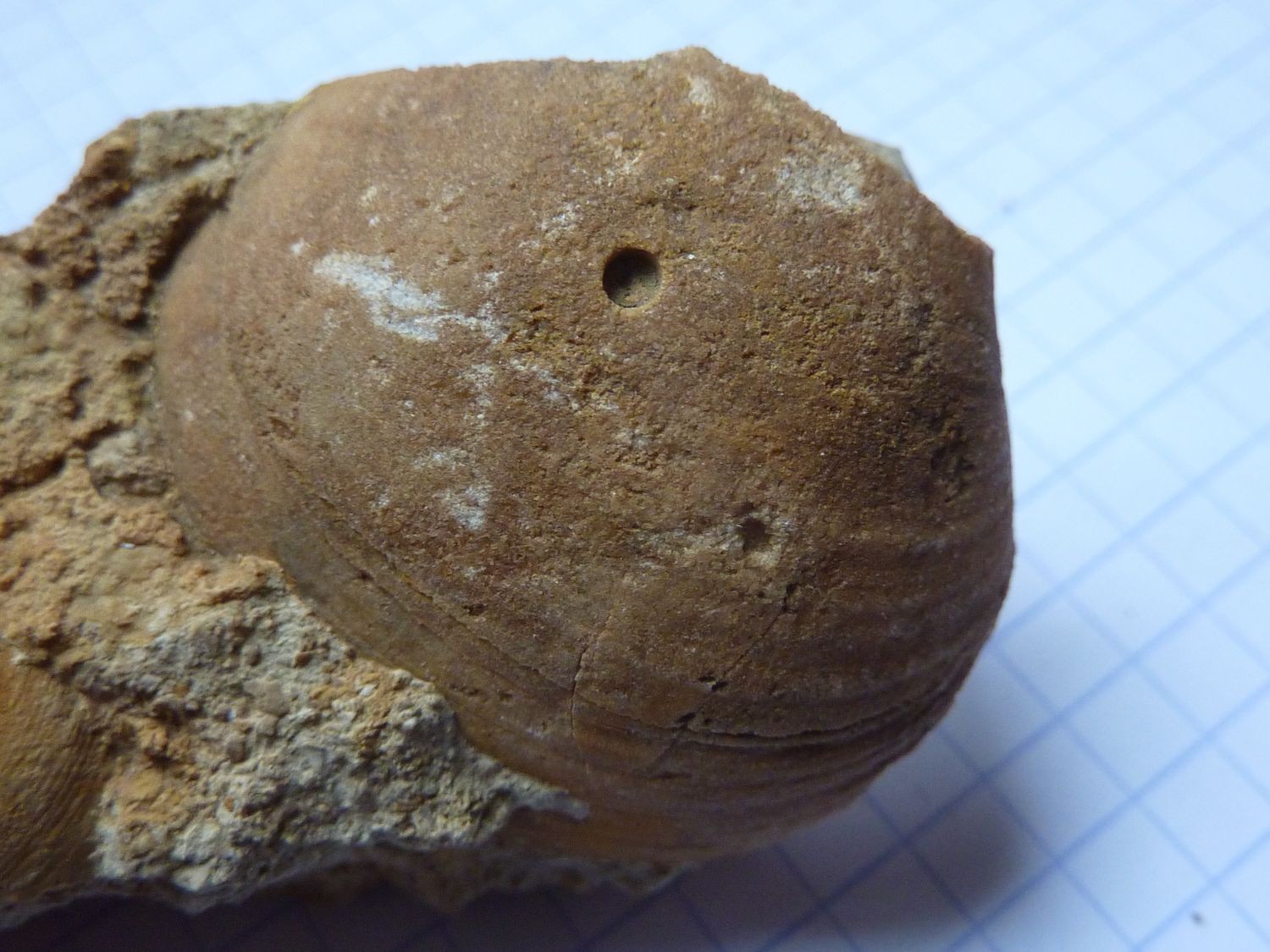 Hauterivien Jeune huitre collée sur un bivalve Dans l'Yonne l'intérieur des huitres ressemblerait presque à des Gryphées ... mais l'extérieur des valves des Exogyra couloni hérissées de pointes n'est pas d'apparence inoffensive ! Pour les brachiopodes de cet étage j'ai beaucoup de mal sur les identifications. Et un bivalve avec un trou de prédation (de murinacé ?) -