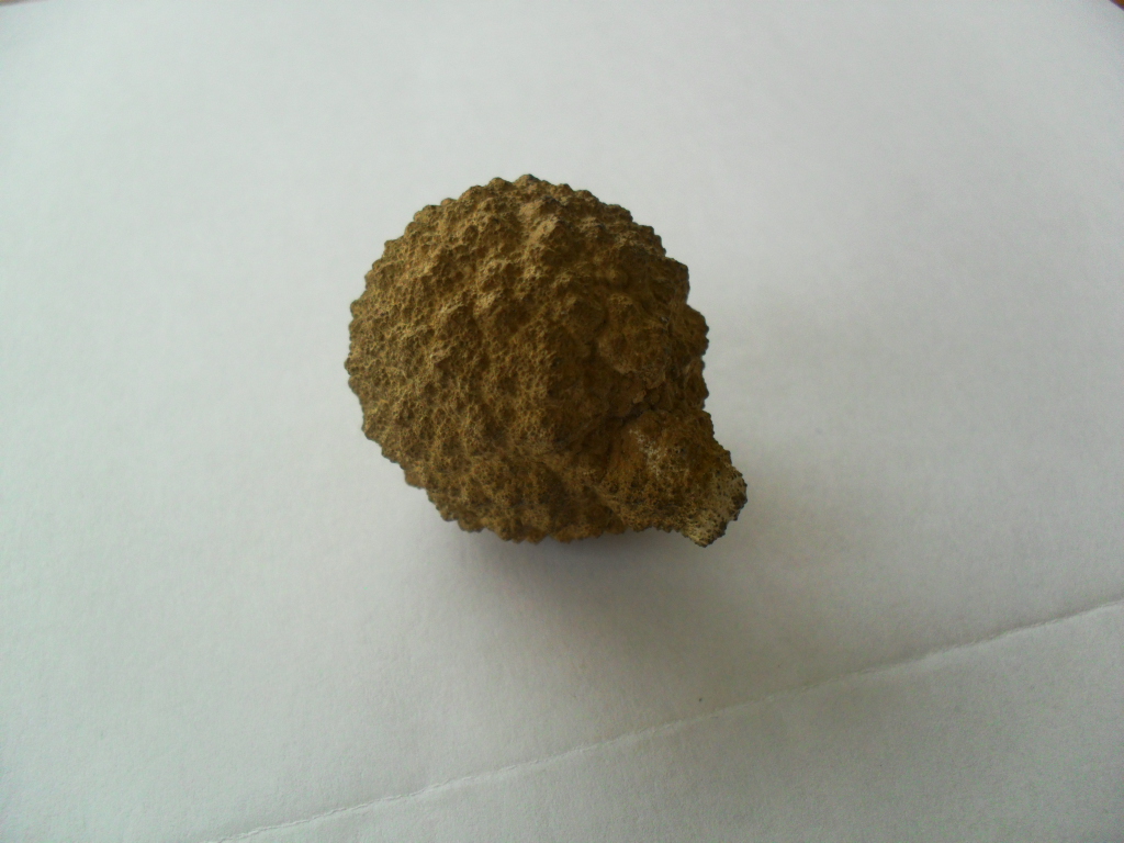 8. Bonjour, En brisant des pierres à la masse (pour empierrement en vue de réalisation d'une terrasse), j'ai remarqué au milieu d'une grosse pierre que je venais de casser, une sorte de nodule étrange. J'ai continué de frapper plus soigneusement afin d'extraire cette chose D'une dimension de 2cm environ, de couleur ocre marron, de forme très régulière et quasi-sphérique, j'ai d'abord pensé à un minerai de fer La surface du nodule est couverte de petits picots très réguliers. Seule une sorte de petit mamelon, proéminence d'environ 3mm, brise l'aspect sphérique. Le nodule est lourd, une centaine de grammes, à peu près le poids d'une balle de golf. Je précise que ce nodule était enchâssé dans un bloc de calcaire (je suis à La Rochelle, 17) En parcourant le site, je déduis qu'il s'agit d'une marcassite, votre avis ? Cordialement (d'autres photos sur demande)