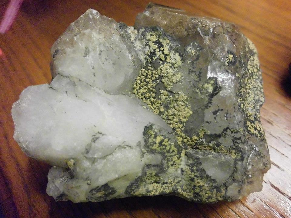 2. super !!! merci pour ces info je prend note pour la 2 pyrite ok mais pourquoi le quartz est jaune ? je ne pense pas que ca soit du uniquement a l'oxidation car les morceaux de pyrite eux ne sont pas oxidée !!! ???!.. et pour le lichen je croit que je vais le laissé ,car c'est la seule piece que j'ai comme ça !!!