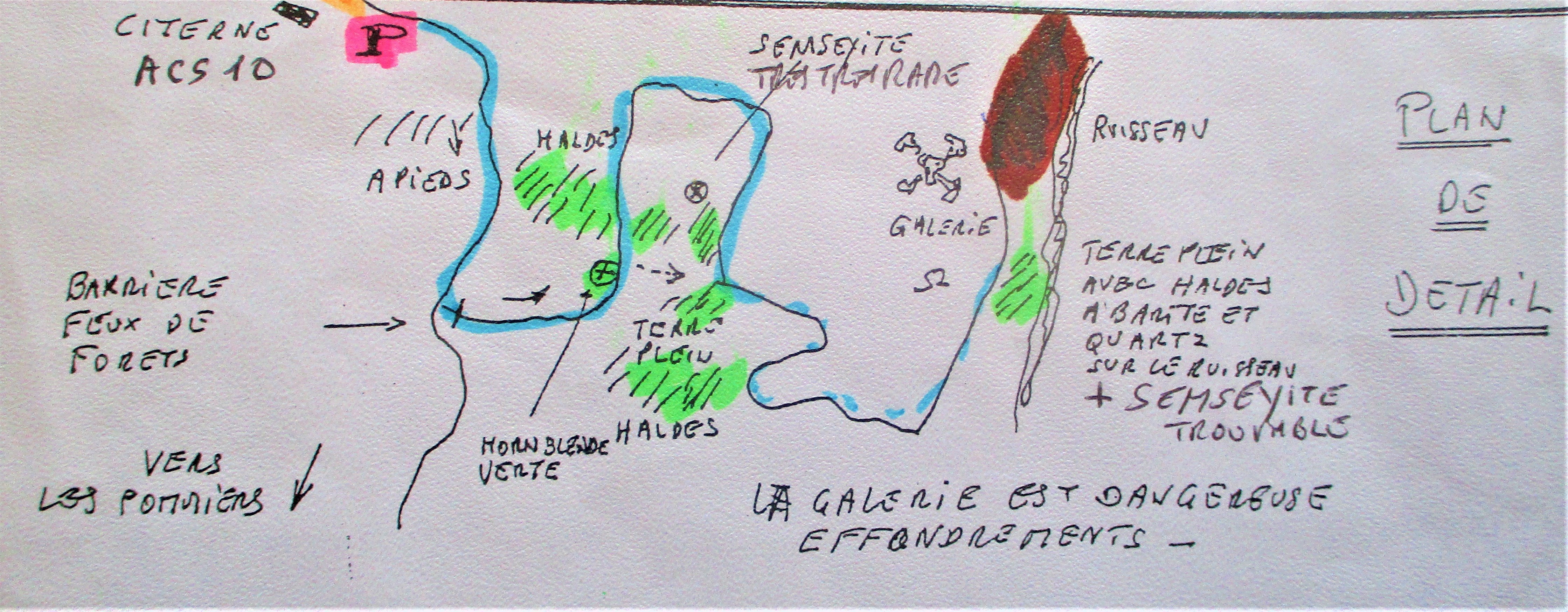 et il n'est pas besoin d'aller sous terre pour trouver de jolies cristallisation de barite - fluorite - calcite - quartz - galene - blende (sphalerite) - pyrite - chalcopyrite - horneblende verte en aiguilles et surtout plus rare semseyite.