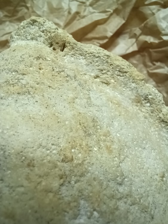 J'ai pas de microscope mais avec une loupe, on s'aperçoit qu'à l'intérieur c'est plus friable et pas de la même couleur (tirant vers le blanc) que "la coquille" qui elle est plus dure (moyennement quand même !) et plus dans le beige.