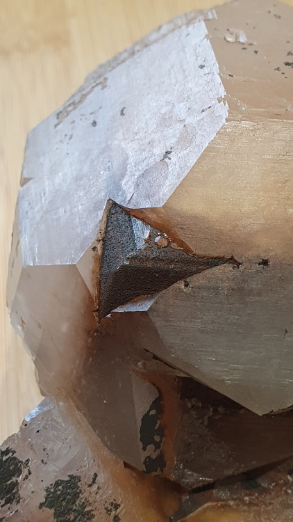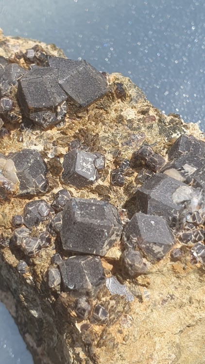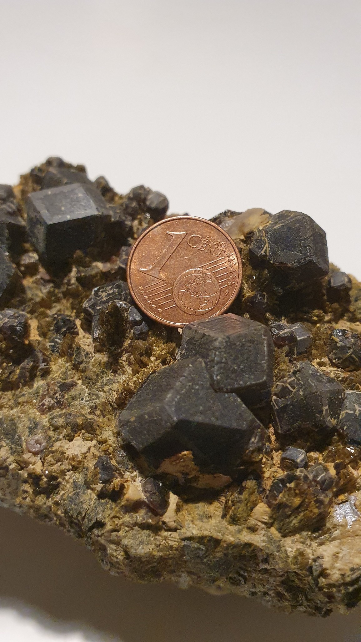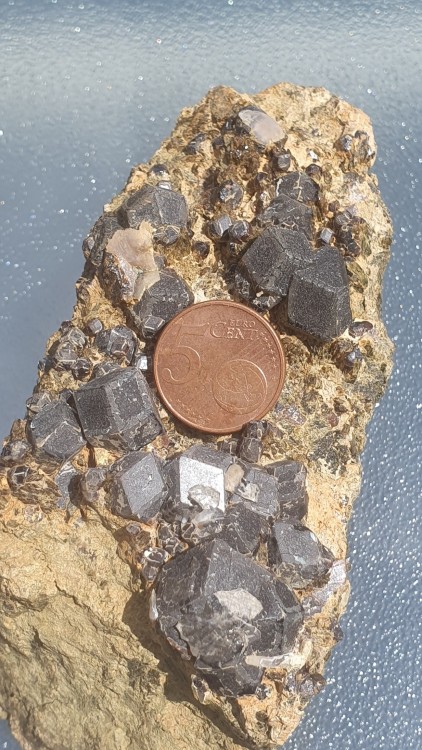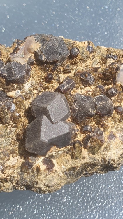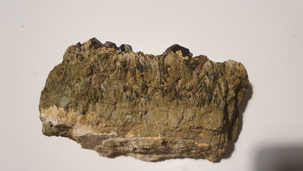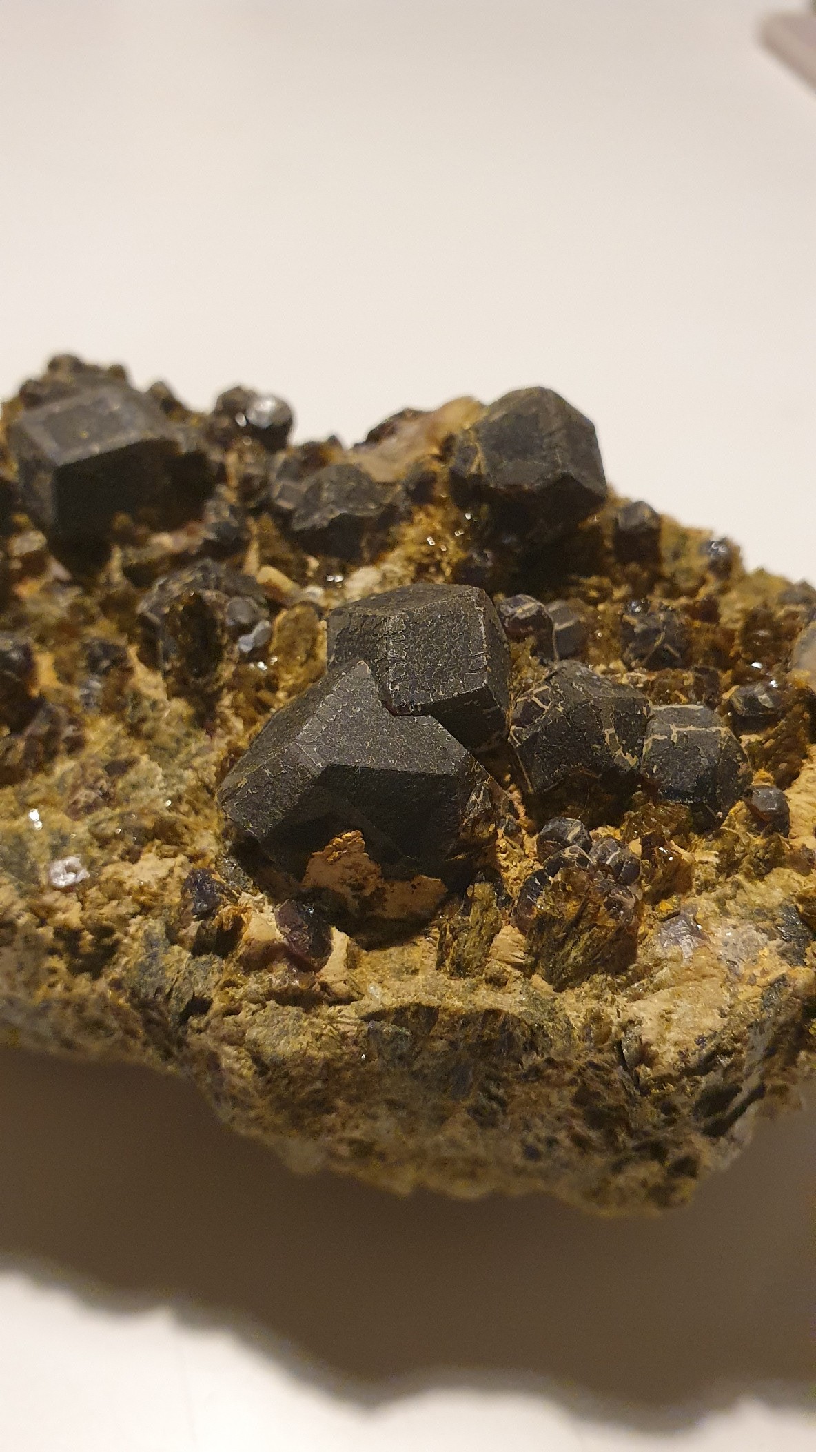 Bonjour, On m'a offert cette pièce et je ne parviens pas à la déterminer, j'aimerais avoir votre aide L'ensemble mesure grossièrement une dizaines de centimètres dans la longueur, 5 dans la largeur et 5 dans la hauteur et pèse 800g. Les cristaux centimétriques, noirs, éclat gras/vitreux, me semblent dodécaédriques, mais pas tous. Ils rayent l'acier et le verre. Je n'ai pas fait le test de l'acide, je n'en ai pas.