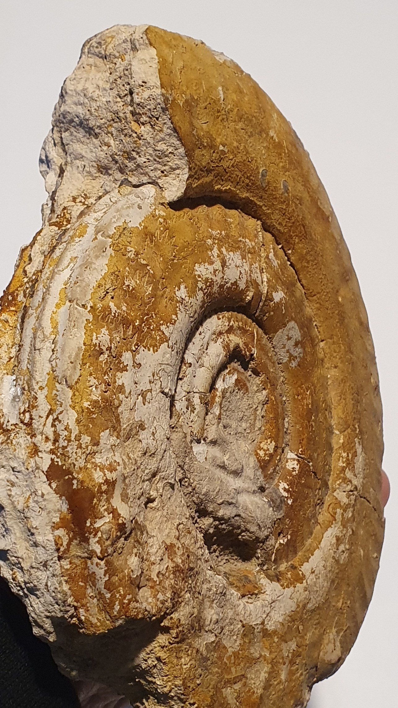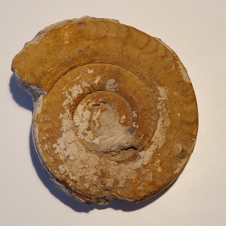 A mon tour de demander votre aide : j'ai reçu en cadeau cette ammonite dont j'ignore la provenance. Rebord latéro-ventral assez prononcé. Diamètre : 16cm, épaisseur 2,5 cm. A l'avance merci pour vos commentaires.