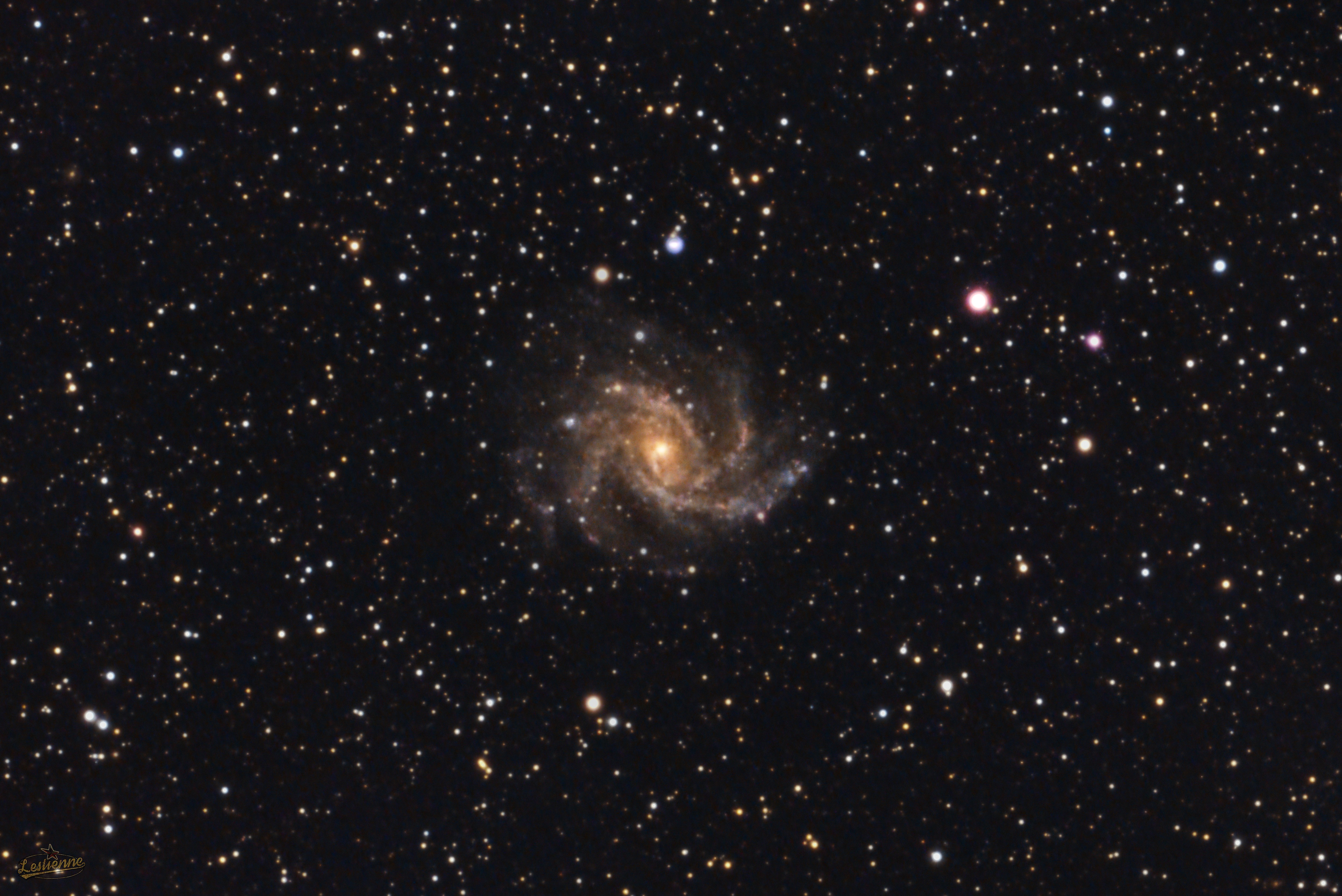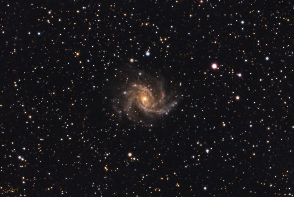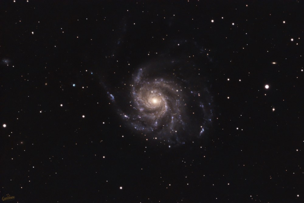 Juin 2024. Voici un empilement de 230 poses de 30s sur M101, la galaxie du Moulinet, située dans la constellation de la Grande Ourse. Lunette Esprit150, 1050mm de focale, caméra ASI183MC. Traitement avec Siril, toilettage avec Photoshop. Attention, activité chronophage... mais je te souhaite bon ciel... -