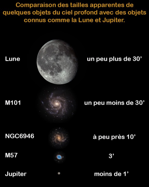 On a de la difficulté (ou on s'en fout !) à se représenter la taille de ces objets sur la voûte céleste. Je vous ai donc présenté M101, NGC6946 et M57 dans un comparatif de tailles apparentes, compris entre deux objets du ciel qu'on a l'habitude de voir : la Lune et Jupiter. -