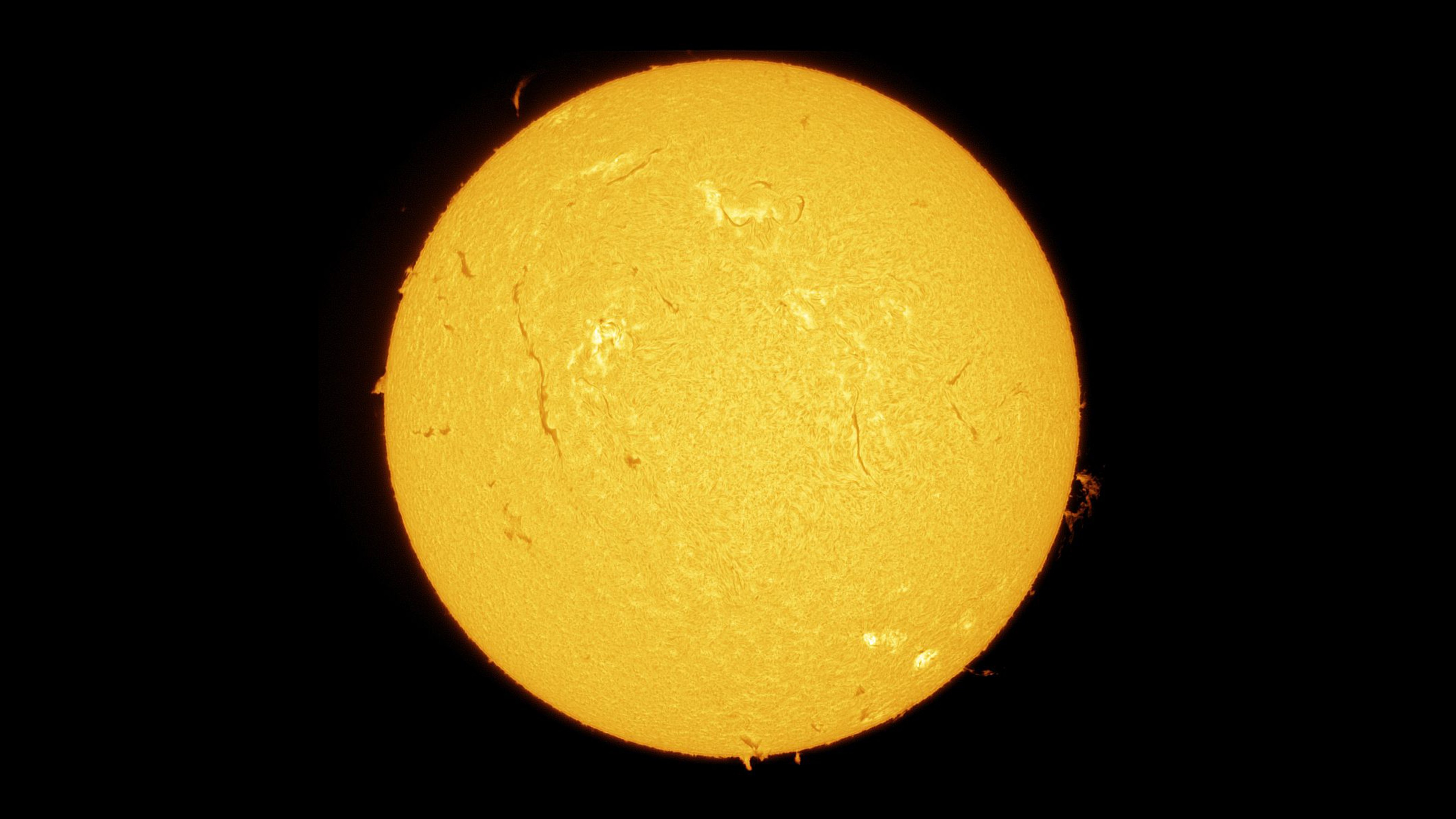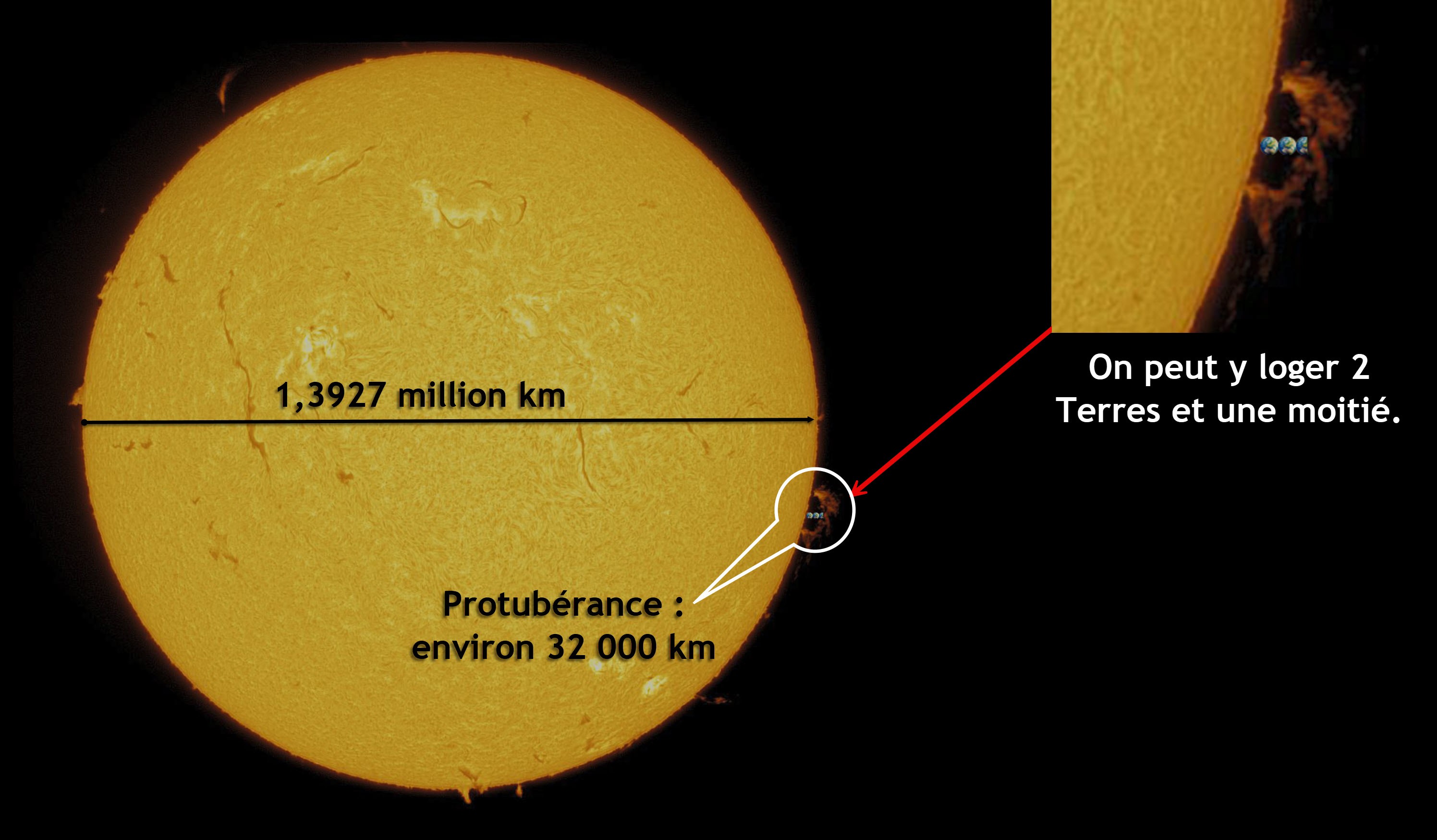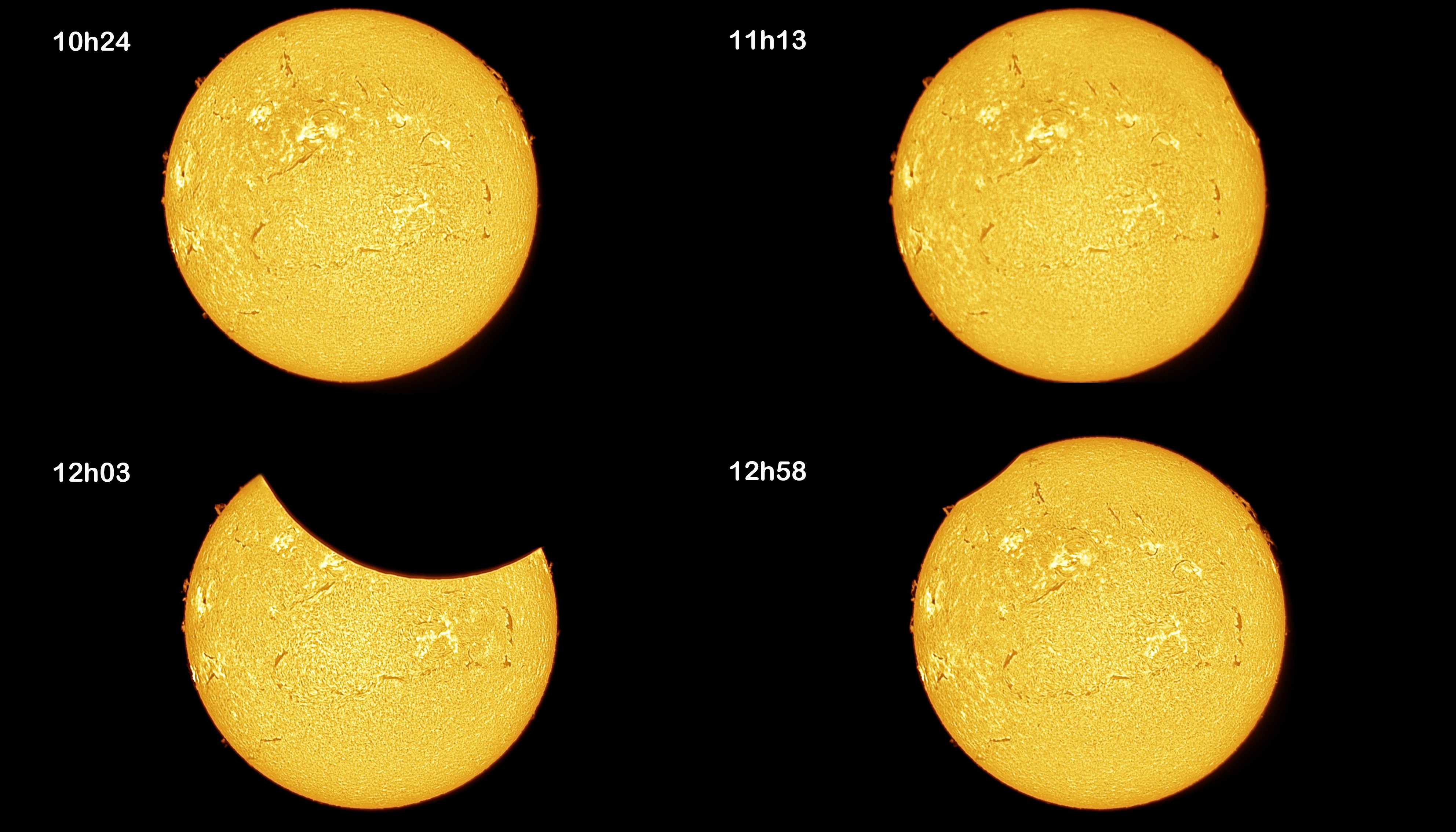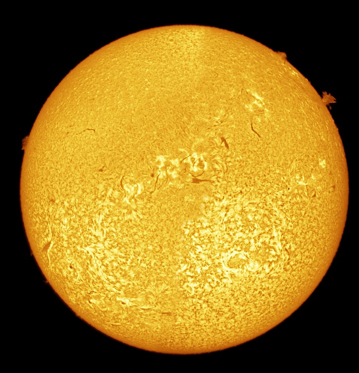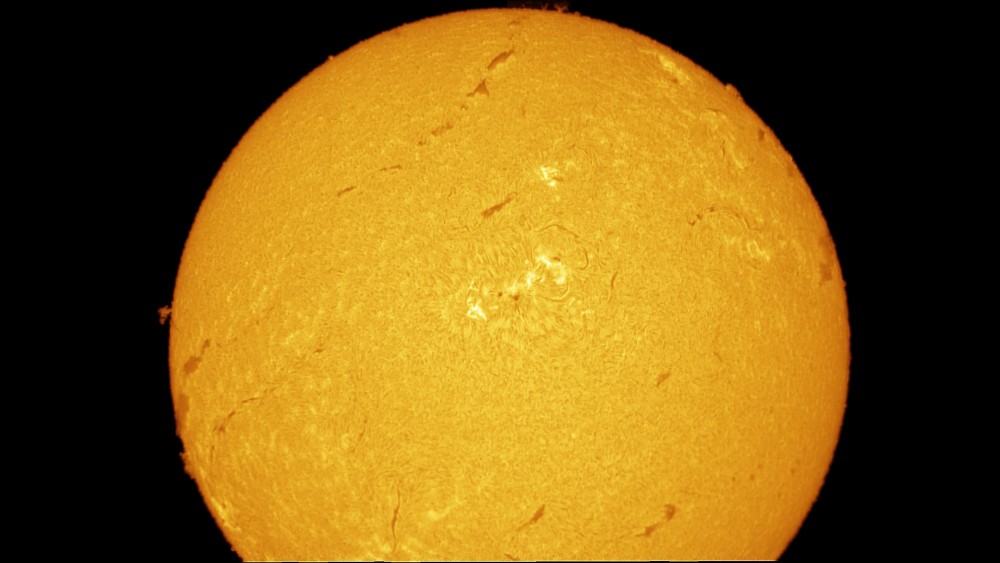Le soleil a rendez-vous avec la Lune chantait le poète... Ce mois-ci nous serons gâtés Le prochain rendez-vous, avant l'éclipse partielle de soleil du 29, aura lieu le 14 mars entre 5 et 7 heures, ça sera pour les lève-tôt. En attendant, pour une fois je ne vous montrerai pas ma Lune, mais bien le Soleil lui-même. J'ai tiré son portrait le 2 mars et le jeudi 6 avec une lunette dédiée à l'observation du soleil - NE JAMAIS OBSERVER LE SOLEIL DANS UN INSTRUMENT SANS FILTRE !!! - l'Héliostar Ha 76 de Skywatcher. Cette lunette ne laisse passer que la lumière dans la longueur d'onde de l'hydrogène, ça tombe bien, le soleil en est composé à près de 75%. Ce sont de fausses couleurs, l'image d'origine est monochrome, et l'observation à l'oculaire donne une image rouge. -