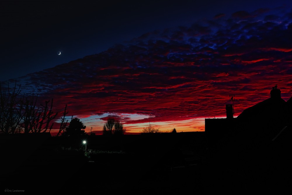 Mai 2020, Ch'Nord. J'ai un peu "poussé" les curseurs ! Mais si peu. Et si près de l'impression que m'avait laissé ce coucher de soleil avec la Lune qui le poursuivait. -