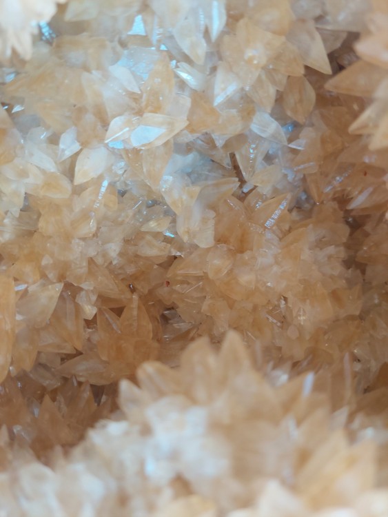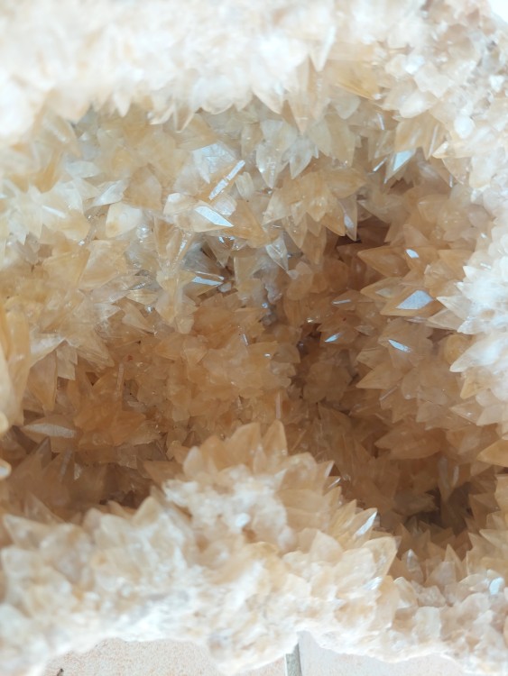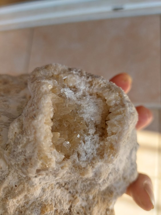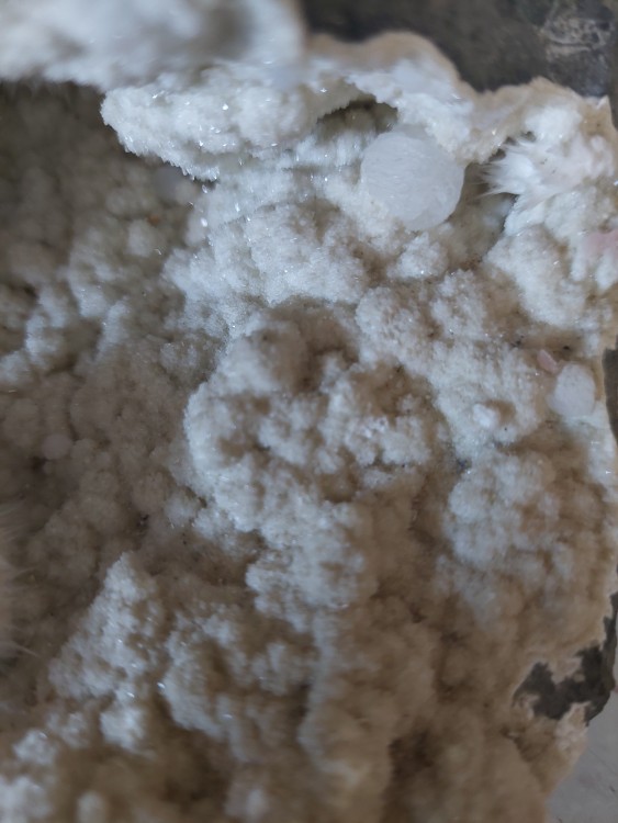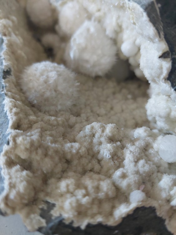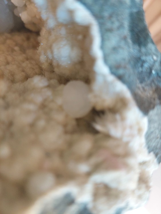 Il y'a egalement des boules rondes translucides comme une sorte de cristal beaucoup plus petites et à 1 endroit des petits cristaux violets et la geode a des petits reflets brillants a l'interieure