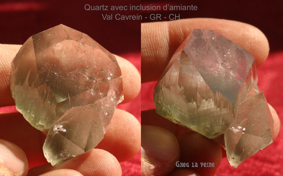 5. j'en doutais absolument pas, c'est bien pour cela que je suis régulièrement vos échanges sur ce post. J'apporte d'ailleurs une précision pour dire qu'à Val Cavrein, les quartz sont avec inclusion d'amiante, d'épidote mais parfois ils sont aussi ... gwindel.... Et là, 'faut reconnaitre que les Suisses ont un petite longueur d'avance ! Dans les Alpes, j'ai vu aussi de belles choses en quartz + inclusion d'amiante du Massif de la Grande Lauzière (mais sans gwindel of course !). Ils sont cependant un peu différents, l'amiante étant notamment + blanche que verte M'enfin, si tu sais pas quoi en faire, je suis très amateur de la chose... :coucou!: Une question cependant sur le quartz à âme avec épidote : elle est en inclusion ? C'est pas très net sur la photo. @u plaisir de partager sur les minéraux des fentes alpines Glücken greg