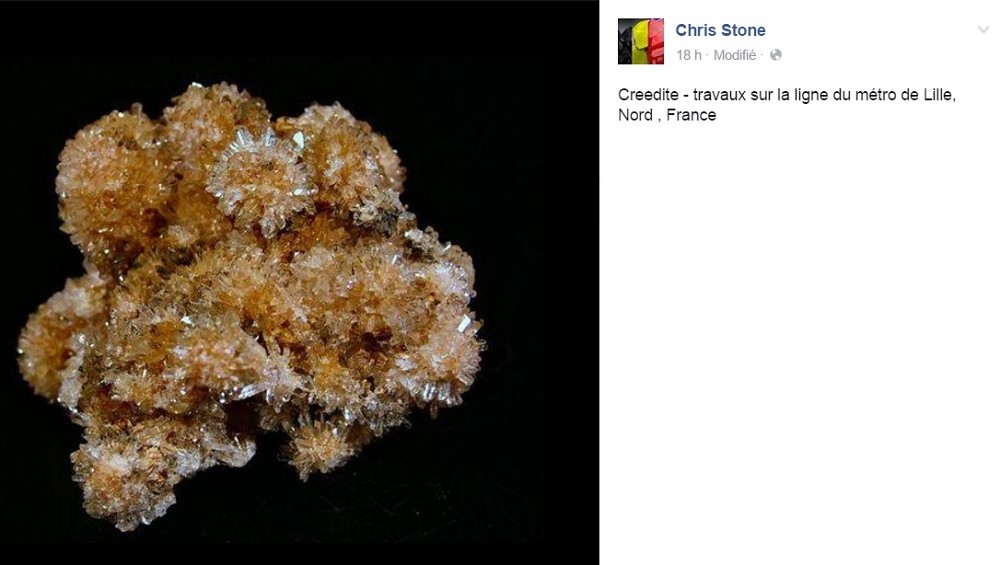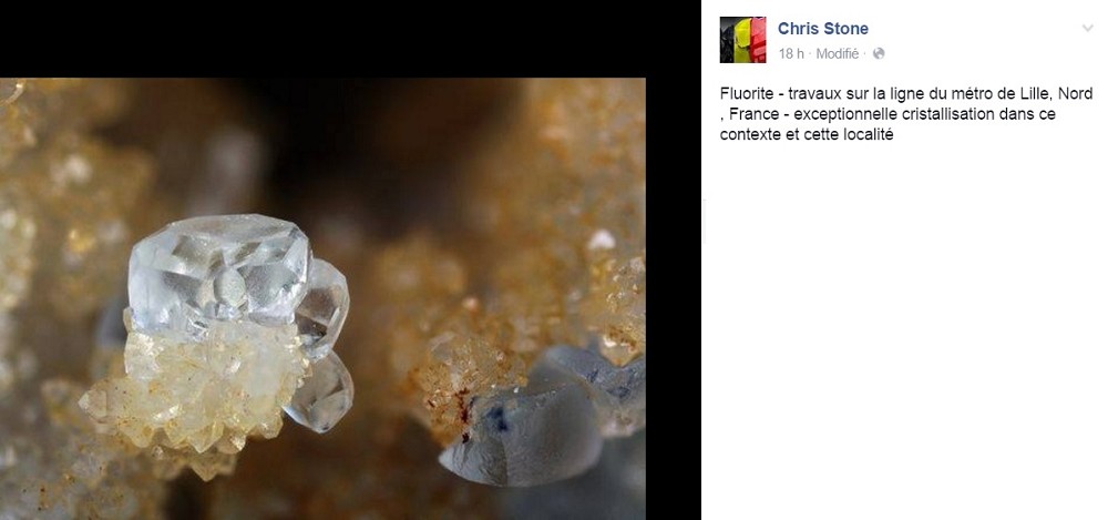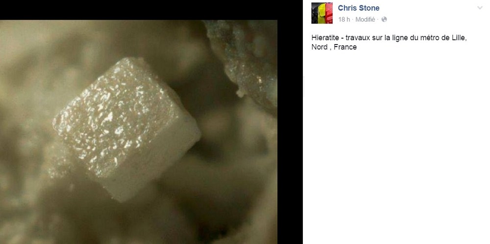 9. Vu passer sur le fil Facebook de Mindat, je relaie ici pour info : " Découverte exceptionnelle de 14 espèces minérales rares dans un filon minéralisé mis à jour lors des travaux pour le métro, à proximité de Lille, Nord, France - des fluorures, alumino-fluorures, silico-fluorures tels que Fluorite massive, Creedite, Hieratite ont pu être récupérées sans trop de dégâts avant que les engins de terrassement n'aient terminés les travaux. A noter qu'un des échantillons examinés a livré une cristallisation de Fluorite bien développée. Examen des nombreux autres échantillons en cours. Une vente par lots pourrait être organisée pour collecter les fonds nécessaires pour racheter à la commune ce filon et le sauvegarder vu sa rareté dans le contexte géologique local." (Chris Stone) Un instant, je vérifie l'info, c'est bizarre... La photo de hieratite est de Enrico Bonacina : http://www.mindat.org/photo-316583.html La creedite est très très semblable à celles de Navidad (Mexique). Vous en pensez quoi ?