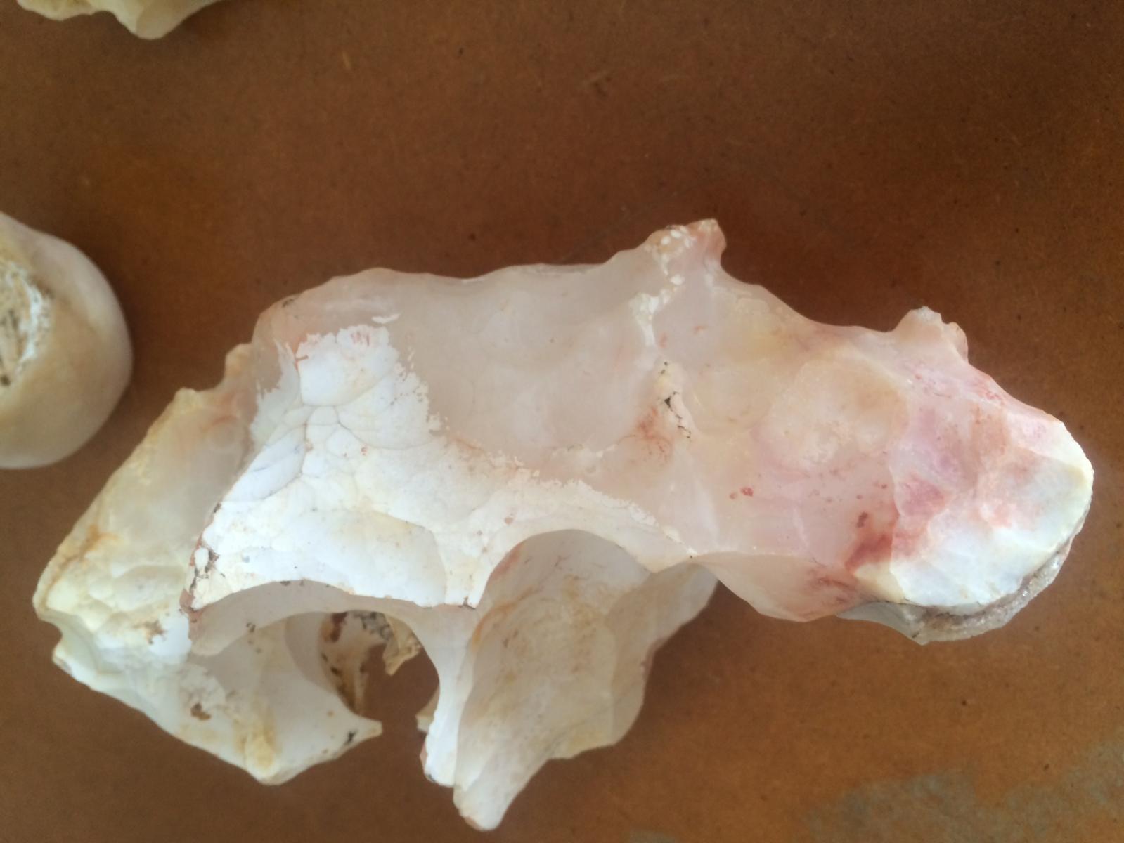 5. Bonjour, Je vous présente un échantillon ramassé à Madagascar dans un de ces fameux "cirques rouges". Voici ci-dessous l’échantillon. Comme vous pouvez le voir il possède une forme assez torturée, comme si elle a été érodée ou dissoute. La partie rose est lise tandis que les parties blanches sont poreuses et absorbes l'eau. (la langue y colle fortement). Je me demande donc si il s'agit de quartz micro-cristallin ou bien d'opale. A noter la présence de minuscules quartz cristallin par endroit. Je ne peut malheureusement effectuer aucuns tests car ces échantillons sont situé aux antipodes de ma position..