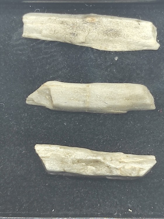 Météorite Sebkha el Melah 001 (SeM 001) Aubrite – Enstatite achondrite Découvert en Mars 2022, près de 17kg de fragments ont été récoltés par les tribus Sahraoui, dans la région de Wad Althath au Mali (245 km au Sud-Est de Taoudenni). Le gros de la trouvaille sera acquis par Bachir Salek (dont la masse principale de 3.5kg) et Mohamed Ali Loud. Cette météorite demeure aujourd’hui (2023) plutôt unique de par la dimension impressionnante de ces cristaux d’Enstatite. Elle présente une texture pegmatitique dont les cristaux se désolidarisent facilement et apparaissent automorphes avec des plans de clivages visibles. De taille moyenne 1 à 2cm, les plus grands atteignent 5cm! Ils sont de teinte beige clair à laiteux. Certains présentant des traces de croutes de fusions de couleurs noires. Les analyses par microprobes montrent que la météorite serait constituée à 98% de cet unique minéral. Des grains mineurs de Diopside, d’Olivine, de Kamacite/Taenite (FeNi), de schreibersite (phosphure de Fe/Ni), et de Troilite (sulfure de Fer) ont aussi été observés à l’état de traces. La composition chimique des Aubrites et les analyses spectrales, notamment menées par le satellite « Rosetta » suggèrent qu’elles proviennent de la ceinture interne et de géo-croiseurs comme les astéroïdes Apollon 3103 Eger. Les mesures de datations apporteraient un âge de formation de 8 à 20millions d’années après la formation du système solaire. Des spécimens types sont conservés dans la collection de « l’institut de Planétologie » de l’université de New Mexico à Albuquerque, USA. Publié dans le Met. Bulletin, n°111 (2022). Lot de trois fragments d’un poids de 0.55g obtenus et certifié par Mohamed Ali Loud (Met gravity), membre IMCA #7502. Origine : Gao, Mali Collection Nicolas Born -