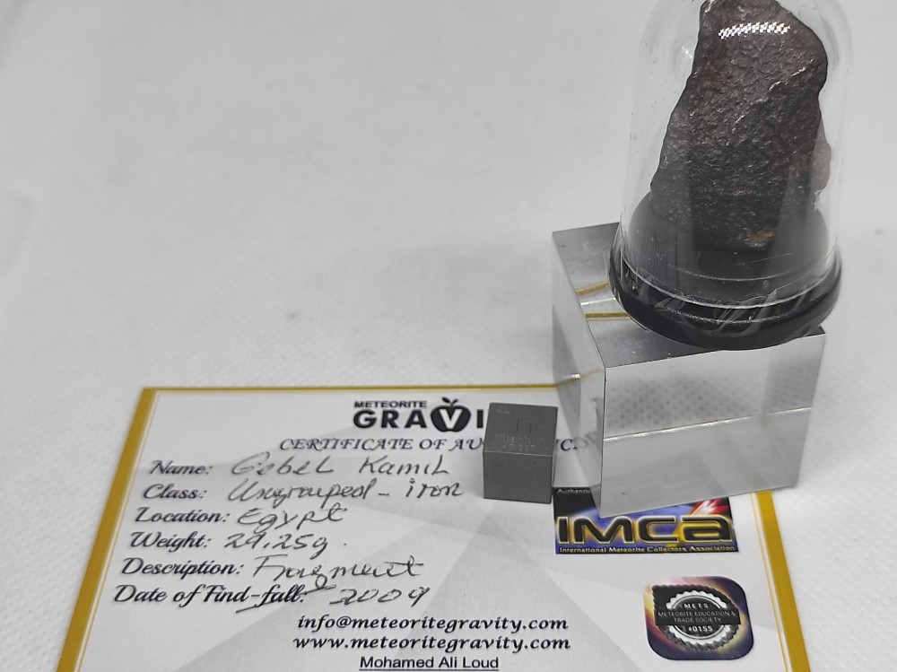 Météorite Sidérite - Gebel Kamil Découverte en février 2019 dans le désert Egyptien par une équipe de géophysiciens Italiens/Egyptiens autour du cratère d’impact de 45m de diamètre de Kamil. Ce cratère fut identifié par V. De Michele, conservateur du Musée d’Histoire Naturelle de Milan en Italie. La campagne géophysique fut menée dans le cadre de « 2009 année de coopération Italiano-Egyptienne dans les Sciences et Technologies ». Près de 1.6T de fragments ont été récoltés (dont un de 83kg couvert de regmaglytes) lors de campagnes de 2009 et 2010. Du fait de la stricte législation concernant l’exportation de ce type d’objets hors d’Egypte, peu de spécimens ne réapparaitront sur le marché jusqu’à 2023 ou un lot conséquent sera proposé à Tucson. Ce spécimen de 29.25g est typique de cette météorite Ferreuse, constituant un shrapnel (fragment) de forme orientée et avec une surface dite à « peau de lézard ». Ayant subie une altération désertique, elle présente une surface oxydée. Les échantillons coupés ont révélés son absence de texture « visible à l’œil nu » et donc dite ataxique (absence de bandes de Widmanstätten ou de zonage dans le domaine visible). Les analyses à la microprobes ont révélées des aiguilles de Kamacite nucléants sur des cristaux de Schreibersite (Phosphure de Nickel). Sa matrice est constituée de Plessite (Fer/Nickel), mélange à proportion égale de Kamacite et de Taenite. Elle présente des concentrations traces de Platine, Or, Cuivre, Galium, Germanium, Rubidium, Rethium, Palladium et Irridium. Des spécimens types sont conservés dans les collections du « Musée de Géologie du Caire » en Egypte, du « Musée National de Siena » et du « Département des Sciences de la Terre de Pise » en Italie. Publié dans le Met. Bulletin, n°98 (2010). Spécimen de 29.25g obtenus et certifié par M. Ali Loud - membre IMCA #7502. Origine : Al Wadi al Jadid, Est Uweinat Desert, Egypte -Collection Nicolas Born-