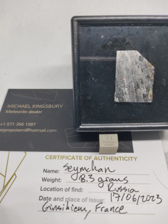 Météorite Sidérite/Pallasite - Seymchan Tranche sciée de 8.3g avec bande de Widmanstatten et Olivine. Découverte en Russie en Juin 1967 dans le lit de la rivière Hekandue, un affluant de la rivière Jasachnaja s’écoulant à proximité du village de Seymchan dans la région de Magadan. La trouvaille originale permettra la collecte d’une première masse de 272kg. Quelques mois plus tard un autre fragment de 50kg sera découvert à 20m de distance avec l’aide d’un détecteur de mines anti-chars! Ces derniers de nature uniquement métallique entraineront son identification originale comme une Sidérite de type IIE. Bien plus tard, en 2004, de nombreux autres fragments seront redécouverts lors de l’expédition menée par Dmitri Kachalin. Contenant des inclusions d’Olivine gemmes, la météorite sera ainsi re-classifiée dans la famille des Pallasites. Seymchan appartient au sous-groupe des Pallasites dites Anomalous « IIE » du fait de sa grande concentration en Irridium. Elle présente de belles figures de Widmanstatten sous formes de bandes inter-croisées, issues de la recristallisation et de la remobilisation du Fer et du Nickel se produisant à des températures supérieures à 1000°C. Ces bandes représentant la co-existance de deux minéraux : la Kamacite (pauvre en Nickel, %<15%) et la Taenite (riche en Nickel +/- 30-60%). Les Pallasites proviennent de la ceinture d'Astéroïdes et se forment par la collision avec un autre corps céleste. Lors de l’impact, le fer fondu du noyau de l’impacteur se mélange au manteau riche en olivine du corps parent. Ce sont les météorites les plus rares (seulement que 1% des chutes sur terre) et les plus recherchées pour leur esthétisme. Le spécimen type de la trouvaille originelle de 1967 est conservé dans la collection de l’académie des Sciences de l’URSS. Autres spécimens conservés dans les musés à travers le monde tel que le «Smisthonian Institut» aux USA, les musées d’Histoire Naturelle de Paris, de Londres, de Munich… Publiée et certifiée (1ere analyse) dans le Meteoritical Bulletin, n°43 (1968). Tranche sciée de 8.3gr, certifié et obtenu de M.Kingsbury (Aego) lors de la bourse de Einsisheim en 2023. Origine : Seymchan, Magadan, Russie Coll. Nicolas Born