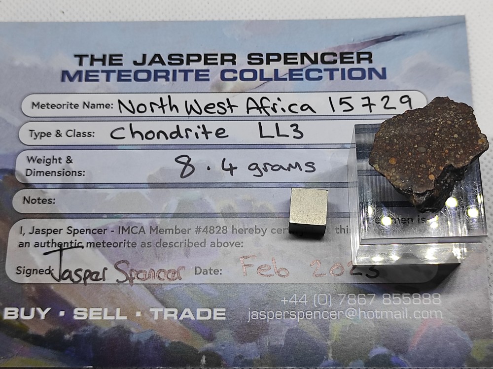 Météorite Chondrite LL3 – NWA 15729 Découverte par des nomades du désert de Mauritanie, seulement 957g de fragments auraient été récoltés. Elle sera identifiée et acquise par Jasper Spencer (membre IMCA#4828) en Juin 2022. Ce dernier la soumettra en laboratoire pour analyse ou elle sera certifiée et classifiée Chondrite LL3. Ce talon scié de 8.4g montre une face brute extérieure ou une grande partie de la croute de fusion à disparue laissant place à une surface d’altération éolienne/climatique typique de cet environnement désertique. Des chondres et leur casts sont déjà discernables. Son aspect intérieur, révélé par le coté scié, offre une ouverture sur sa structure pétrographique. De teinte générale brune, elle laisse apparaitre une grande densité de chondres à Olivine/pyroxène (généralement 1-3mm, et jusqu’à 5mm), au contour très bien définis (Type 3, n’ayant pas subie des contraintes de pression/température la structure est restée dans sa forme originelle). Ces derniers sont englobés dans une fine matrice vitrifiée dite « mésostase ». Elle comporte des phases de sulfures altérées (Troilite FeS) et en rares/mineures proportions de métal (Kamacite et Taénite Fer/Nickel). Elle est classée «LL » pour sa très faible concentration en fer (faible susceptibilité magnétique mesurée). Les chondrites sont des fragments éjectés de la ceinture principale par un choc entre deux astéroïdes. Les chondres sont issus de la condensation de poussières de la nébuleuse solaire et de la solidification rapide de minuscules gouttes de liquides silicatés et légèrement ferreux. Ont les dits "indifférenciées ou primitives" car elles témoignent de la nature chimique de notre planète avant que ne se produise la ségrégation croute/manteau/noyau. Spécimens ‘’type’’ conservés dans les collections du « Muséum d’Histoire Naturelle de Berlin » en Allemagne. Analysée et publiée dans le Meteoritical Bulletin, n°112 (2023). Spécimen de 8.4g obtenus et certifiés de J. Spencer (membre IMCA#4828) à Einsishein 2023. Origine : Mauritanie, Afrique de l’Ouest Collection Nicolas Born