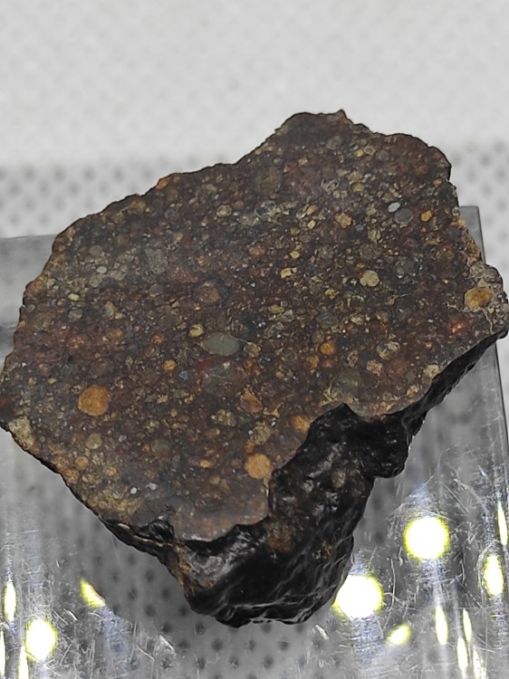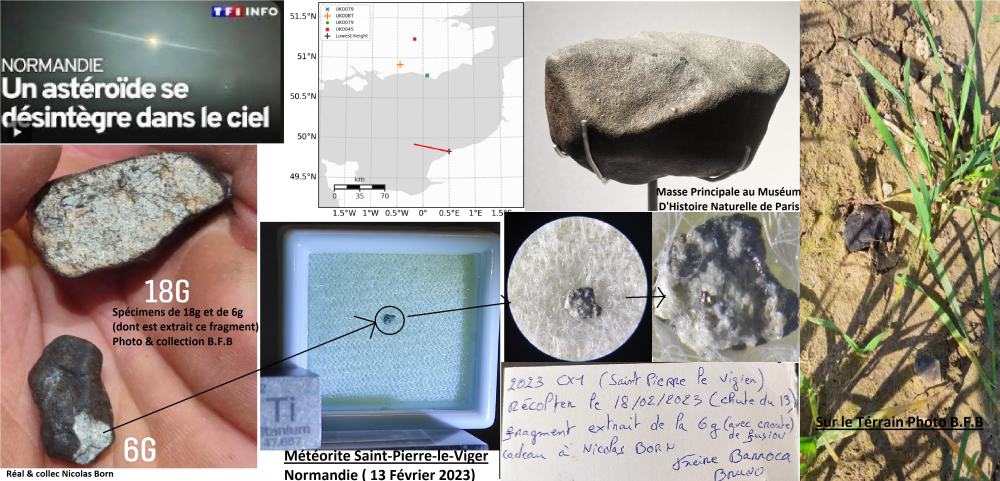 Météorite CX1- Saint Pierre le Viger - Normandie Chondrite L5-6 – Chute le 13 Février 2022 (France) L’Astéroïde 2023 CX1 (Sar2667) fut découvert le 12 Février 2023 à 20h18 par Krisztian Sarneczky, un astronome Hongrois, travaillant à l’observatoire astronomique de Matra. En collaboration avec l’observatoire de Tican (Croatie), il calcula son orbite et prédit l’entrée possible ce corps d’1m3 dans l’atmosphère terrestre au-dessus du canal de la Manche le 13 février à 2h59. Par la combinaison d’observations de télescopes professionnels, de caméras de surveillance et d’observations de réseaux amateurs et professionnels, son entrée dans l’atmosphère fut enregistrée et par triangulation une ellipse de trajectoire de chute put être déterminée en Normandie. Mené par l’observatoire de Paris et le MNHP, les réseaux Fripon et l’équipe Vigie-ciel fut dépêchée sur place. Dès le 15 février les recherches dans le champ de chute délimité furent entreprises et à 16h50, le premier fragment (94g) fut découvert par Lois Leblanc-Rappe. Dans les jours qui suivent de nombreux prospecteurs et collectionneurs internationaux arriveront sur les lieux, ce qui conduira à la découverte de nombreux autres fragments (une vingtaine estimée) pour un poids total compris entre 1.2kg et 2kg. Le plus gros fragments (175.2g) sera découvert par Steve Arnold (prospecteur Américain renommé et «star» de Reality TV show) et sera acheté par l’investisseur Bill Bungay qui en offrira le dépôt permanent au Musée d’Histoire Naturel de Paris (MNHNP). Ce micro spécimen (<0.5g), a été trouvé par Bruno Freire Barroca (un prospecteur Français d’Ile-de-France) le 18 février 2023. Il s’agit d’un fragment extrait de la pierre de 6g qu’il a découvert. Bruno trouvera quatre spécimens conséquents (28g, 18g, 6g et 5g) sur plusieurs jours de recherches (environ une cinquantaine d’heures de marche cumulées). Son observation au microscope présente sur son coté extérieur brut une belle croute de fusion noire et fraiche. Sa face interne, plus claire, offre une ouverture sur sa nature pétrologique et présente des reliques de chondres (bulles silicatées Olivine/Pyroxène) au sein d’une matrice «mésostase». Un grain de métal libre y est visible. Les analyses effectuées en laboratoire sur les spécimens du Museum ont permis de la classifier en Chondrite L5-6, bréchique, avec intraclasts et fentes de tensions. Les contours des chondres sont mal définies et les phases minérales ont été refondues et apparaissent homogènes. Ce fait traduit qu’elle a été soumise à des contraintes de température/pression de fort métamorphisme (type 5-6). Sa faible proportion en métal et pauvre susceptibilité magnétique la classe en L. La matrice contient des Plagioclases mais aussi Chromite, Merrillite (Phosphate de calcium anhydre) et des phases métalliques Troilite avec de rares grains de Tetrataenite (alliage natif Fe/Ni). Les chondrites sont des fragments éjectés de la ceinture principale par un choc entre deux astéroïdes. Les chondres sont issus de la condensation de poussières de la nébuleuse solaire et de la solidification rapide de minuscules gouttes de liquides silicatés et légèrement ferreux. Ont les dits "indifférenciées ou primitives" car elles témoignent de la nature chimique de notre planète avant que ne se produise la ségrégation croute/manteau/noyau. De nombreux spécimens ont rejoints les laboratoires et collections du CEREGE (d’Aix-en-Provence), du Muséum D’histoire Naturelle de Paris, de celui de Nantes et de celui de Burgring en Autriche. Analysée et publiée dans le Meteorical Bulletin N°112 (2023) du Lunar & Planet International Institut. Micro fragment (<0.5gr) extrait d’un spécimen de 6g découvert par Bruno Freire Barroca le 18 Février 2023. Origine : Saint-Pierre-le-Viger, Normandie, France - Découverte B. Freire Barroca, Collection Nicolas Born -
